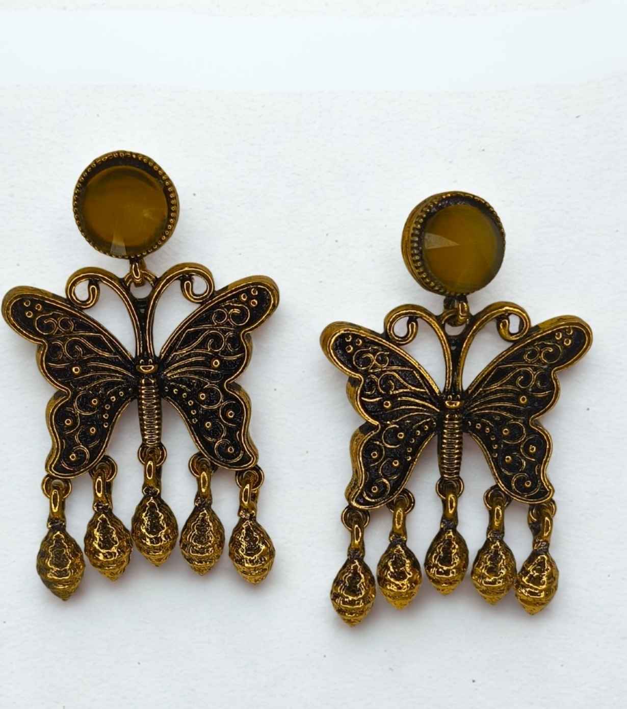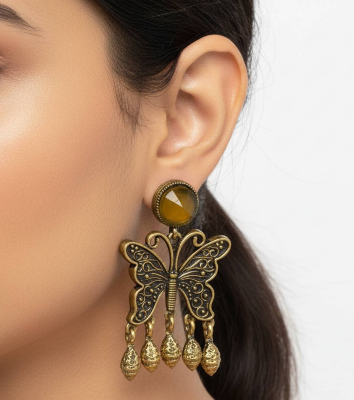 Add a warm, radiant touch to your jewellery collection with these antique butterfly statement earrings, highlighted by a rich amber-hued stone stud. The intricately crafted butterfly wings showcase detailed engravings in an antique gold finish, creating a timeless vintage aesthetic. Finished with multiple textured gold drop charms, these earrings sway gracefully with every movement, making them ideal for festive celebrations and elegant fusion styling.