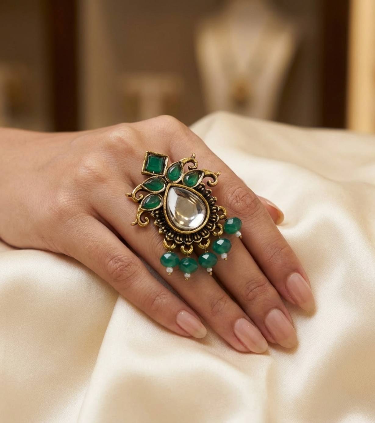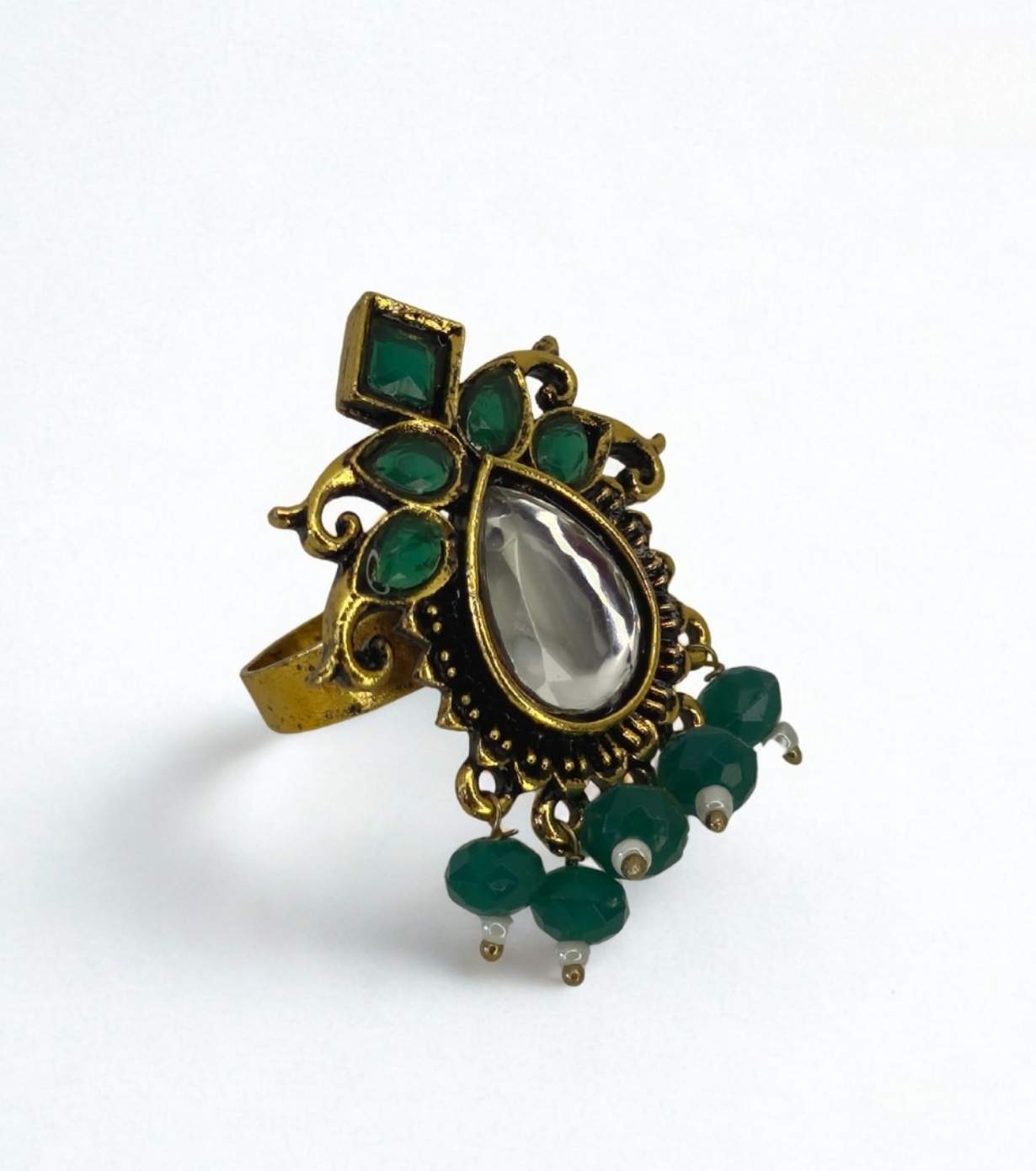 These elegant antique gold kundan earrings feature a striking teardrop-shaped central kundan stone, beautifully framed with rich green glass stones in a floral-inspired pattern. The detailed antique finish adds a vintage charm, while the green bead drops at the bottom create a graceful, festive movement.