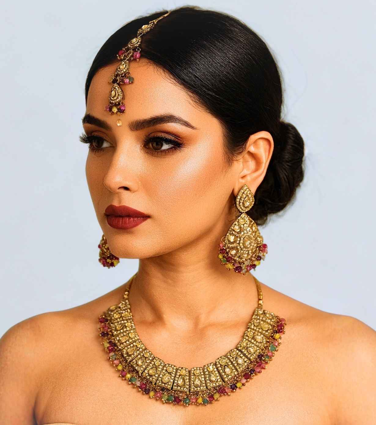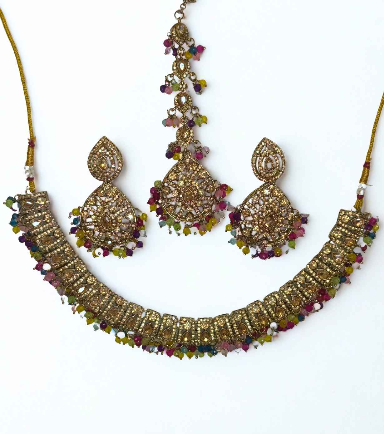 Be the first to review “Antique Gold Kundan Necklace Set with Multicolour Beads & Maang Tikka”