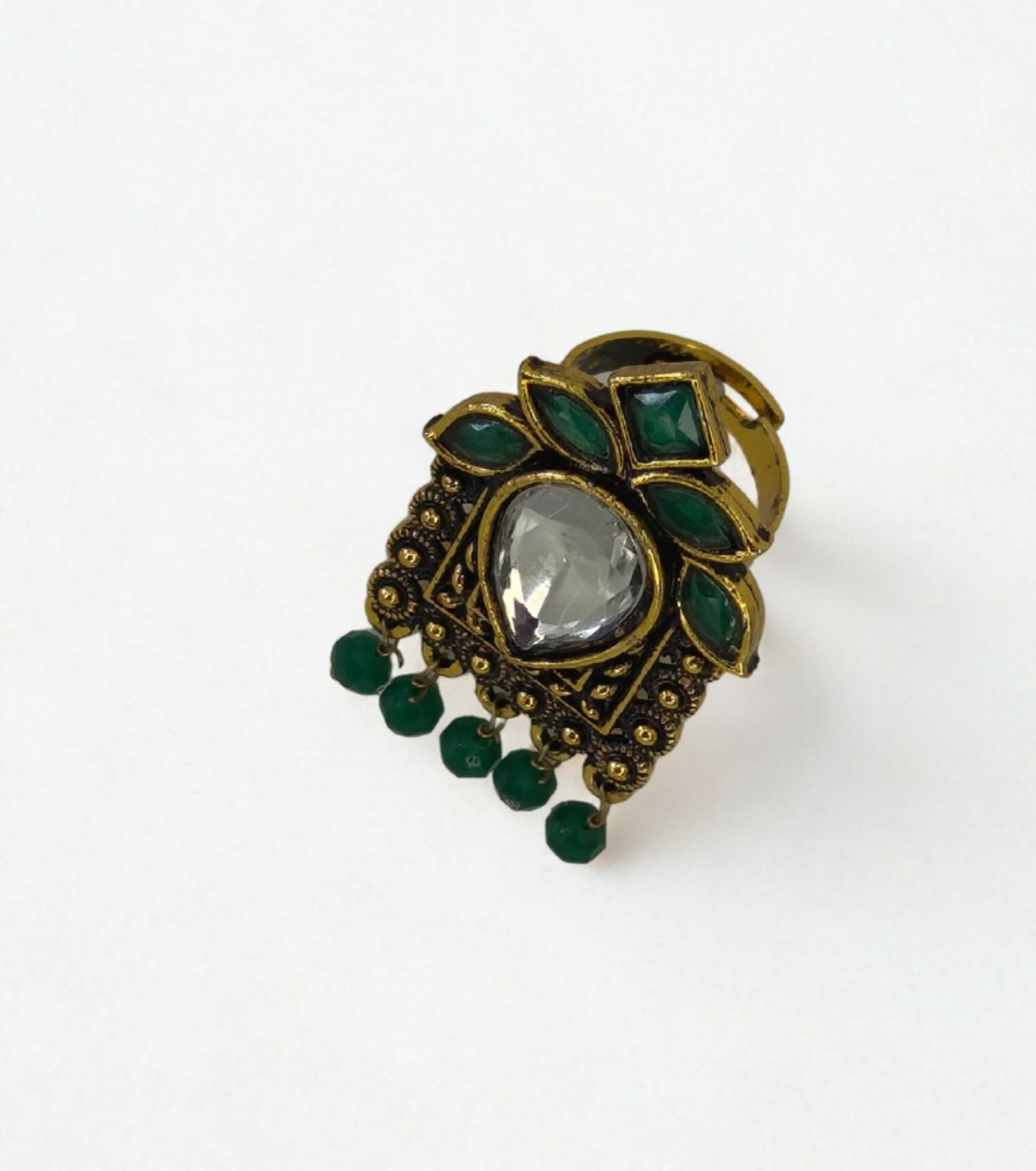 Antique Gold Kundan Ring with Green Stone Bead Drops