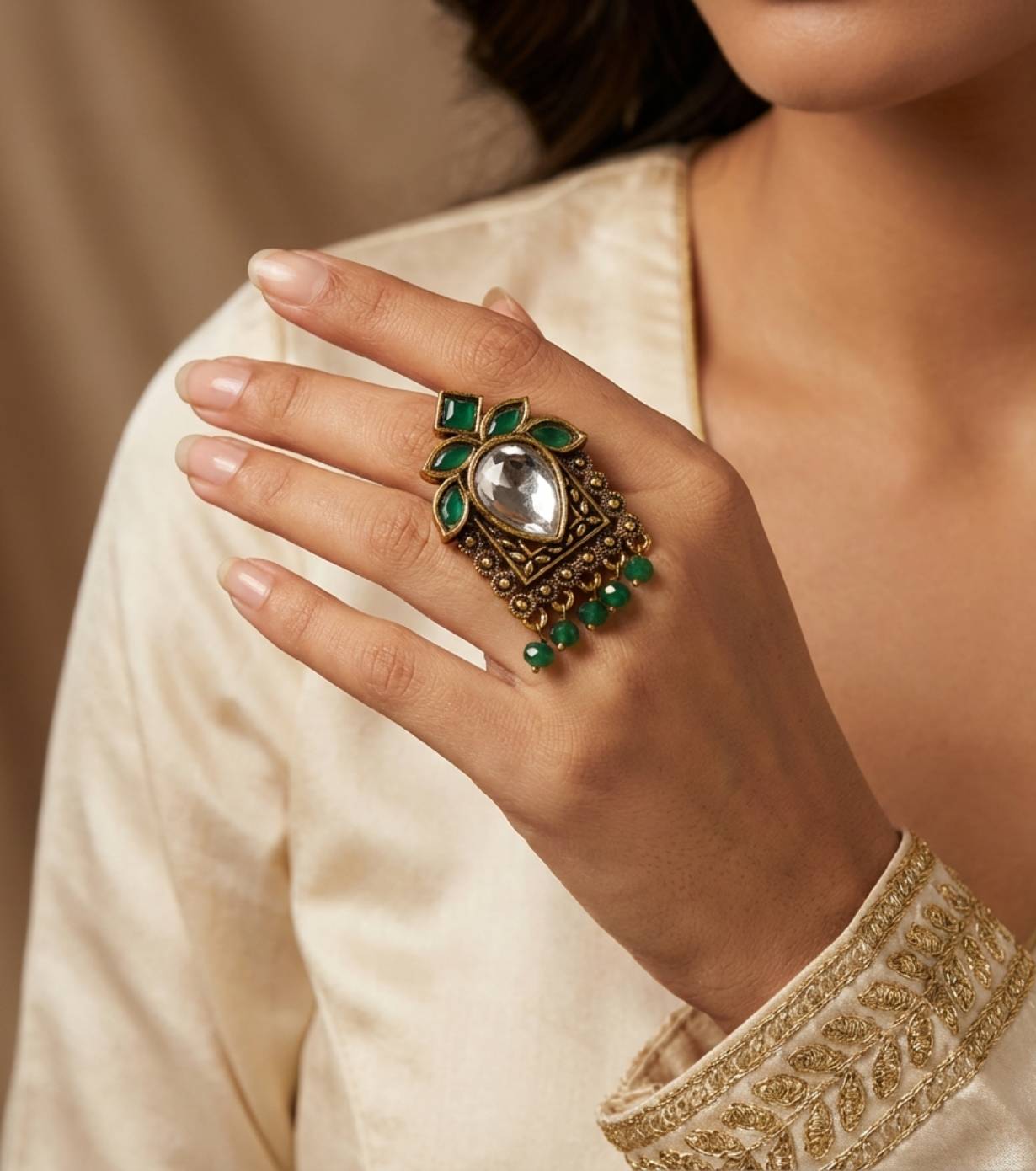 This elegant antique-style kundan ring brings together traditional charm and rich detailing. At the centre sits a teardrop-shaped kundan stone that reflects light beautifully, framed with deep green stone accents in a floral-inspired design. The antique gold finish enhances its vintage appeal, while the delicate green bead drops at the bottom add gentle movement and a graceful finish.