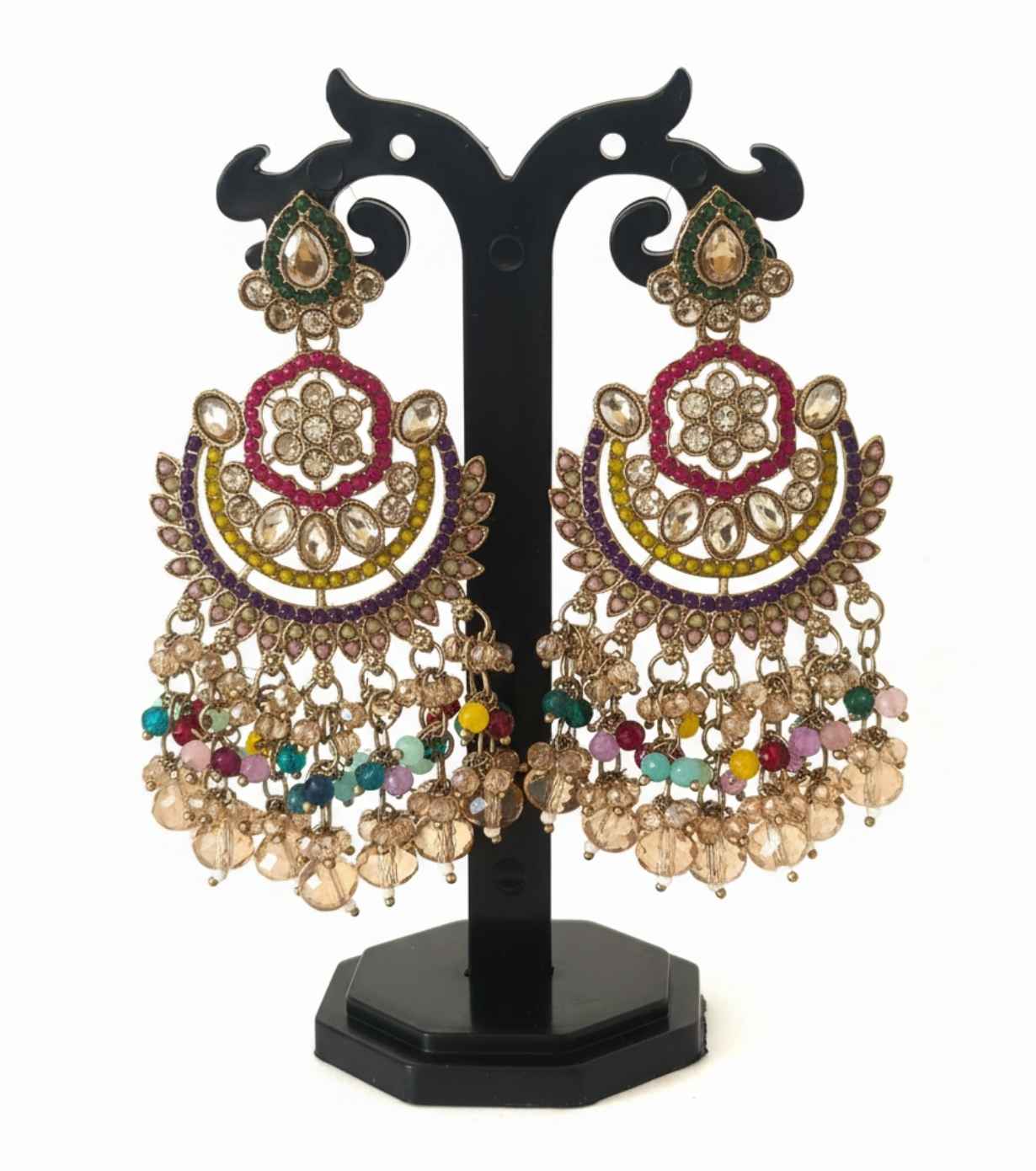 Antique Gold Multicolour Kundan Chandbali Earrings with Beaded Drops