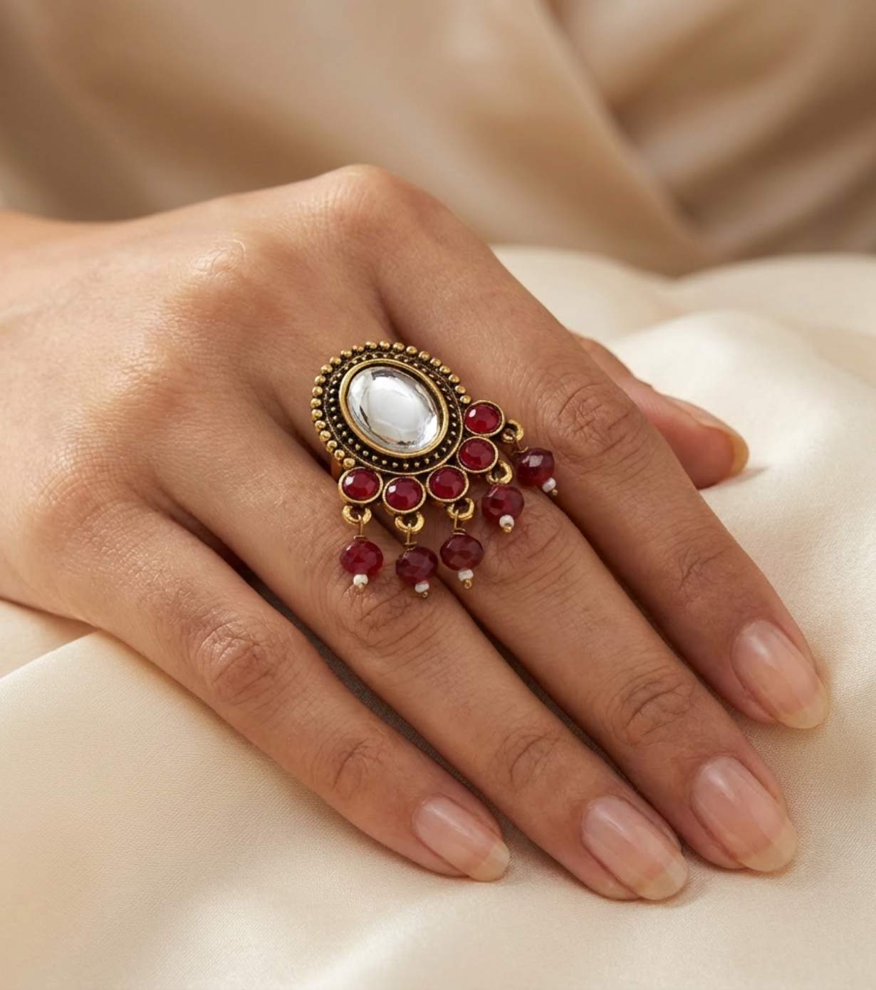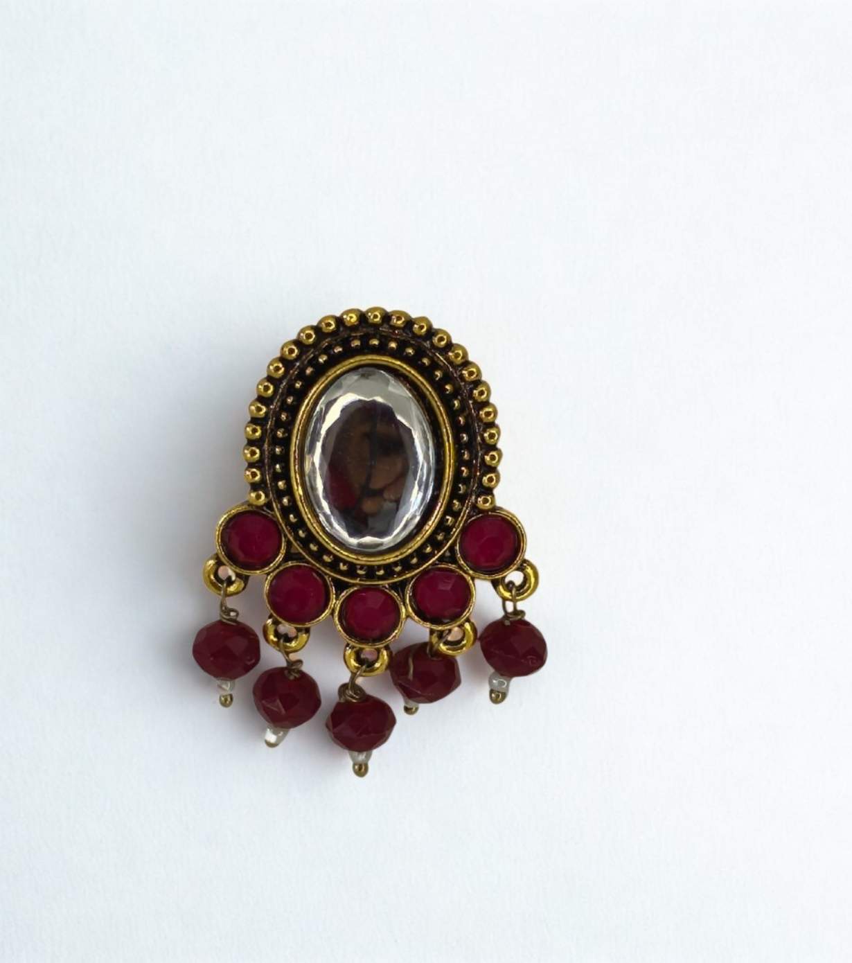 Add a touch of royal elegance to your ethnic look with these antique gold kundan statement earrings. Featuring a classic oval-shaped central kundan stone surrounded by delicate red glass stones, this design reflects timeless Indian craftsmanship. The deep red bead drops add graceful movement, making these earrings perfect for festive and wedding wear.