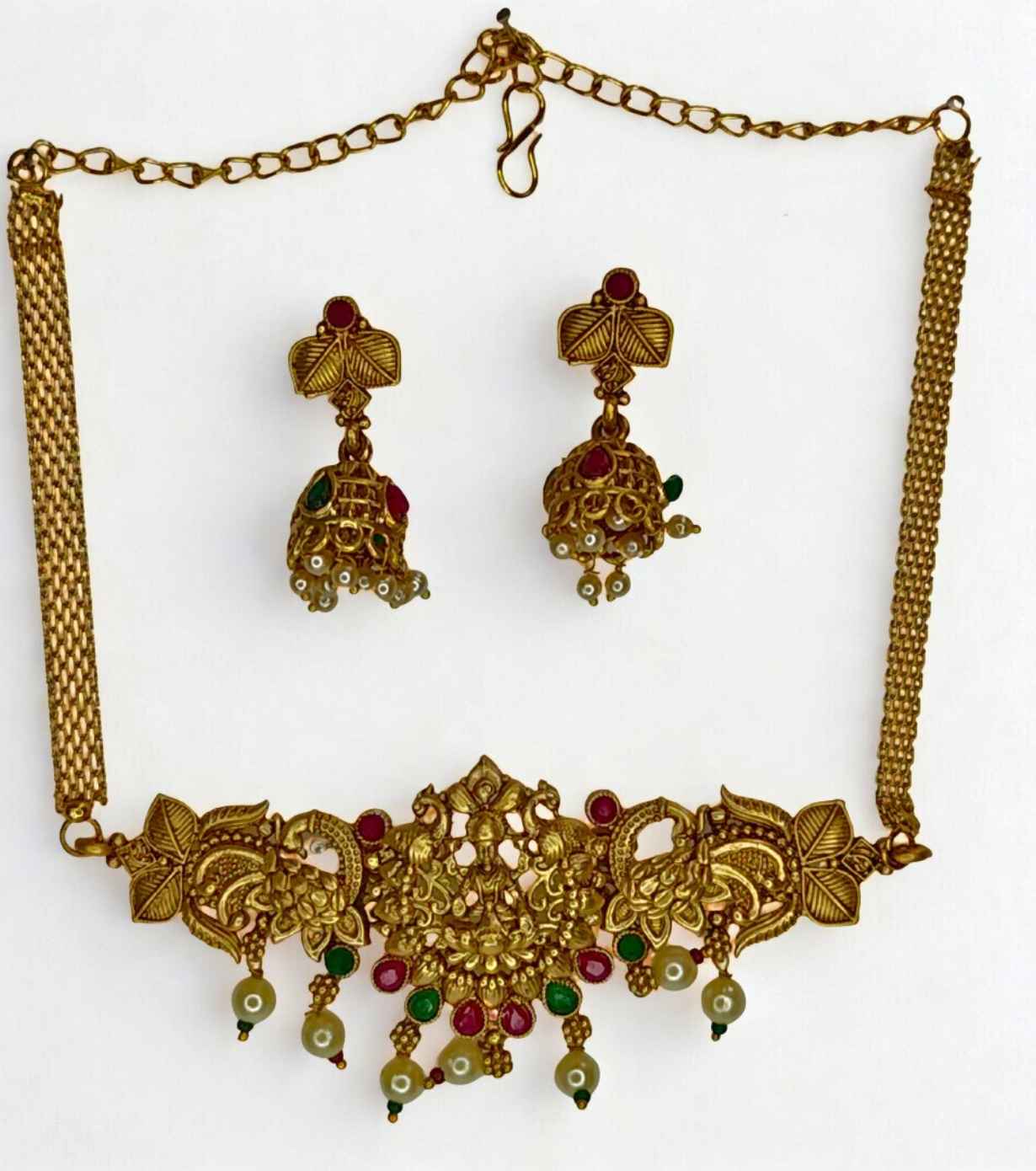 Antique Gold Temple Jewellery Necklace Set with Jhumka Earrings