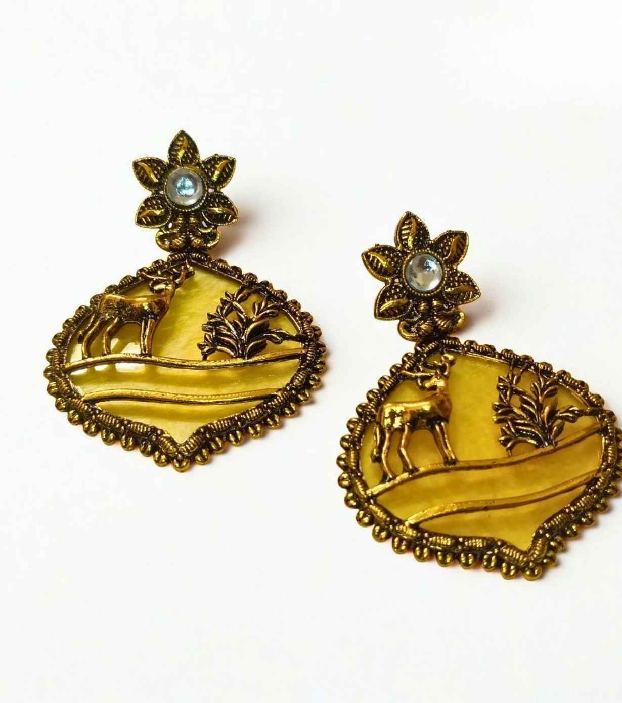 Add a warm, radiant touch to your ethnic look with these handcrafted antique gold tribal earrings, featuring a finely detailed deer motif set on a rich yellow enamel base. Inspired by Indian folk art and nature, this design beautifully blends heritage charm with bold statement styling.