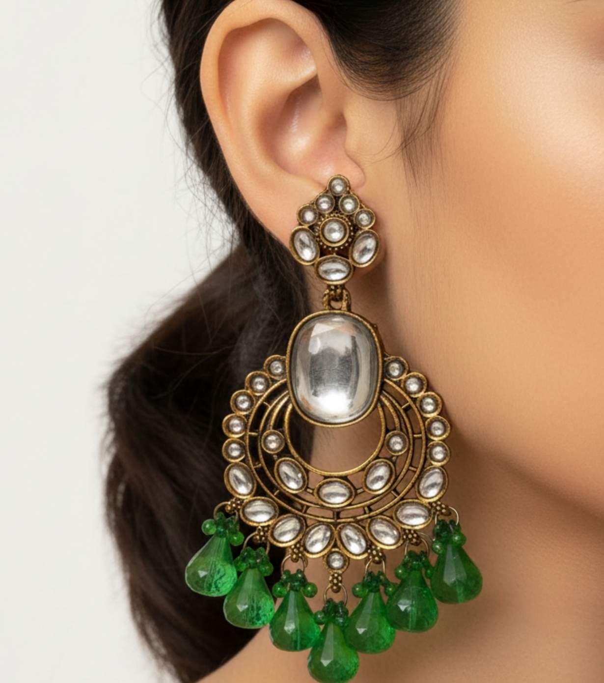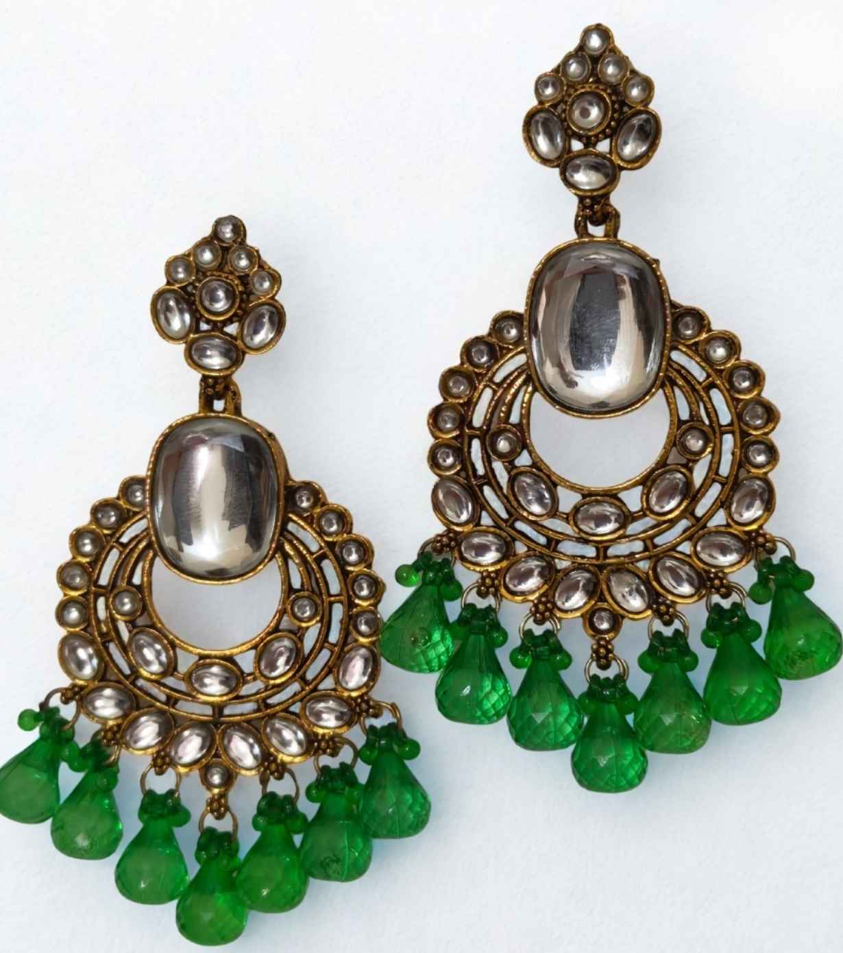 Step into timeless elegance with these antique Kundan chandelier earrings, crafted with beautifully set Polki-style stones arranged in layered circular frames. The design is enhanced with rich emerald green faceted bead drops, adding depth, movement, and royal charm. Finished in an antique gold polish, these earrings are a striking choice for weddings, festive occasions, and traditional celebrations, effortlessly elevating sarees, lehengas, and ethnic ensembles.