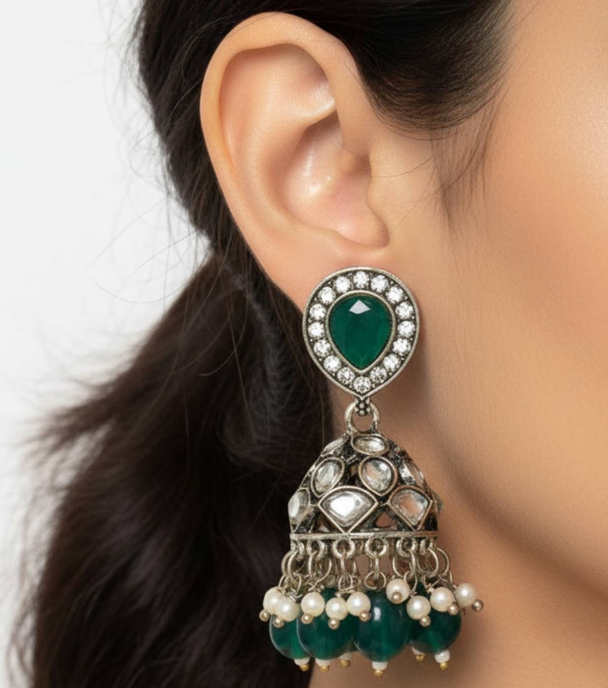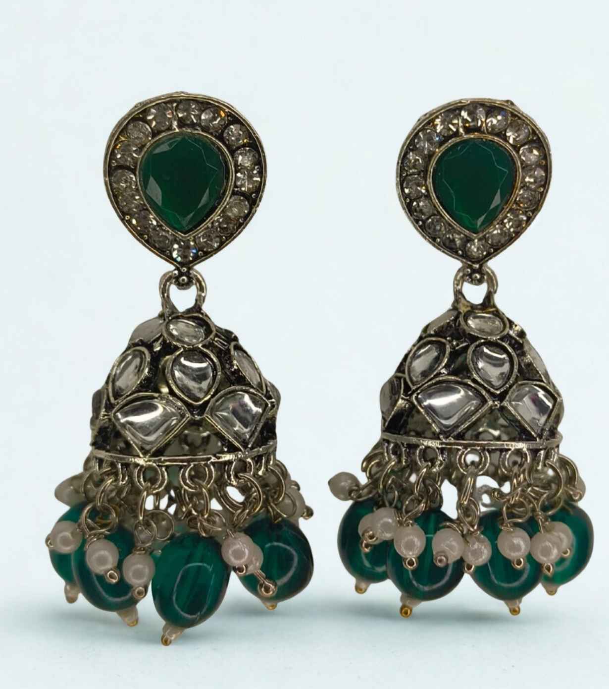 These stunning Antique Kundan Jhumka Earrings with Emerald Green Stone Studs showcase a rich emerald green teardrop stone stud, encircled by sparkling kundan crystals for a refined ethnic glow. The beautifully crafted dome-shaped jhumka is adorned with classic kundan detailing and finished with emerald green glass bead drops and soft pearl accents, adding graceful movement and traditional charm. The oxidised silver-tone base enhances the vintage aesthetic, making this pair perfect for festive and wedding wear.
