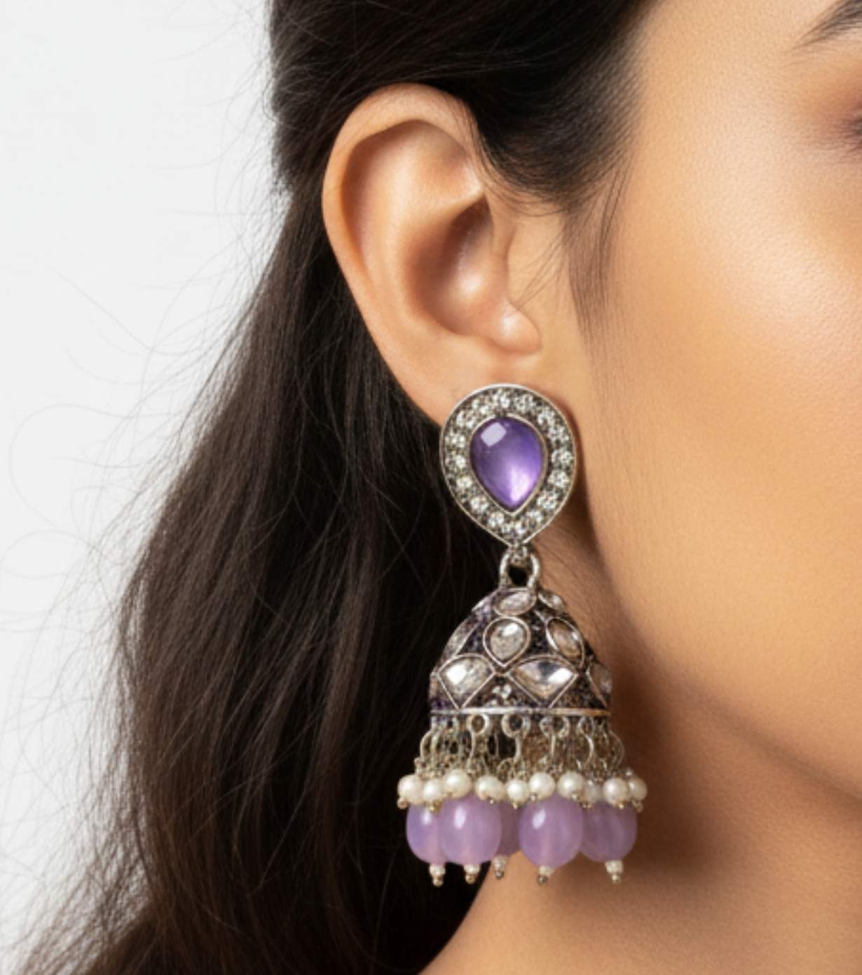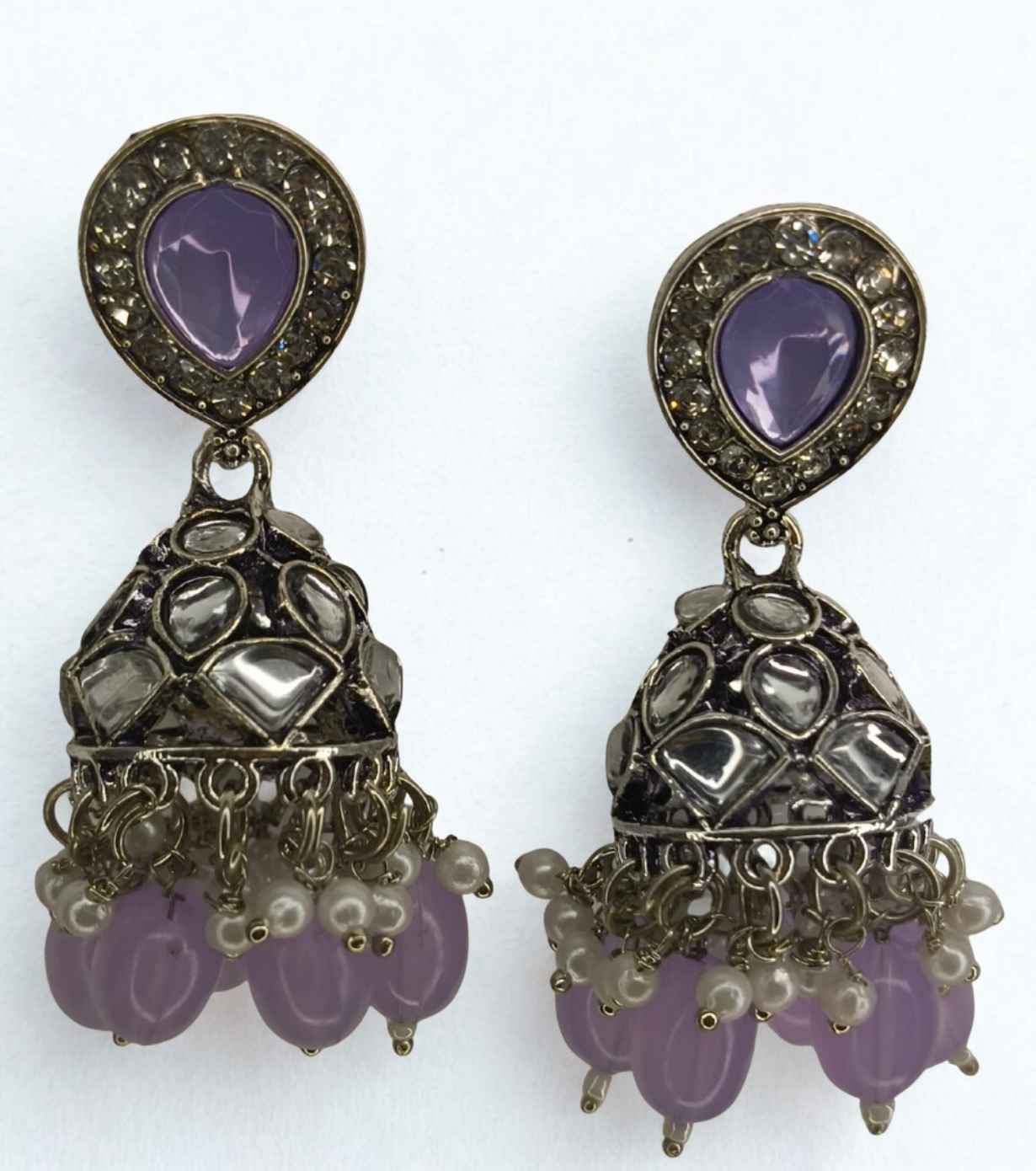 These timeless Antique Kundan Jhumka Earrings with Lavender Stone Studs showcase a soothing lavender teardrop stone stud, encircled by shimmering kundan crystals for a refined ethnic look. The beautifully detailed dome-shaped jhumka is adorned with classic kundan work and finished with lavender glass bead drops paired with delicate pearl accents, creating graceful movement and a soft pop of colour. The oxidised silver-tone base enhances the vintage charm, making these earrings a perfect blend of elegance and tradition.