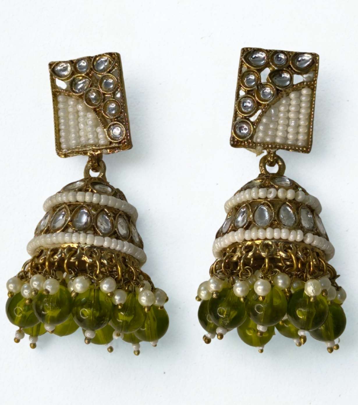 These Antique Kundan Jhumka Earrings with Olive Green Bead Drops feature a rectangular stud highlighted with kundan-style stones and intricate pearl beadwork. The beautifully layered dome jhumka is finished with olive green glass bead drops, creating a refined and timeless appeal. The antique gold tone enhances the traditional craftsmanship, making it a versatile festive accessory.