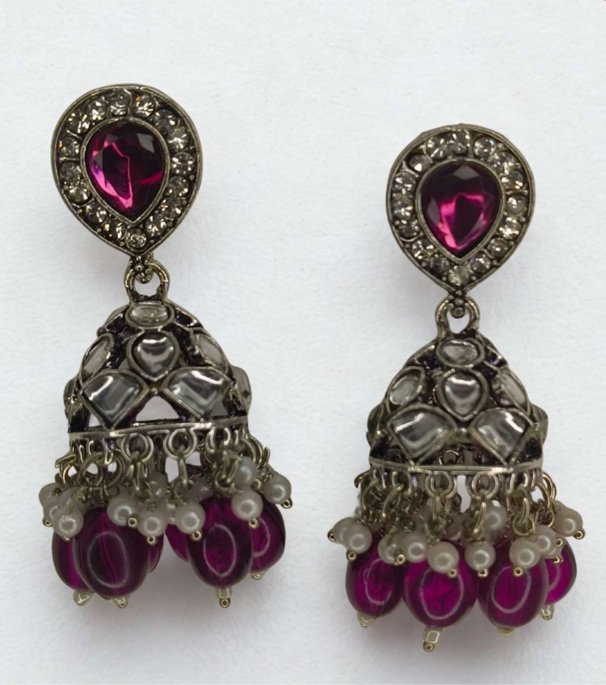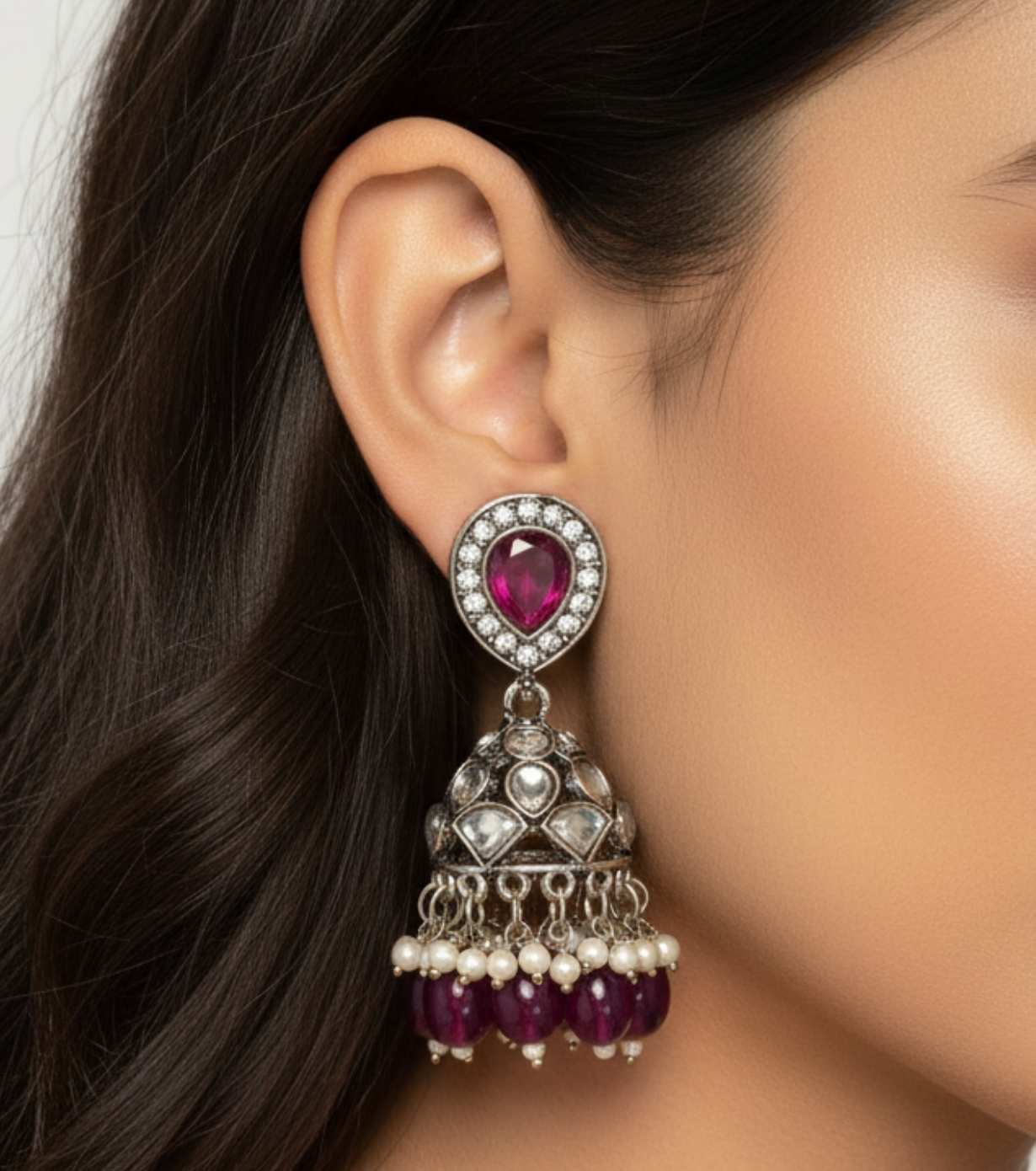 These elegant Antique Kundan Jhumka Earrings with Ruby Wine Stone Studs are highlighted by a deep ruby wine–coloured teardrop stone stud, framed with shimmering kundan crystals for a regal finish. The intricately crafted jhumka dome is embellished with traditional kundan detailing and finished with wine-coloured glass bead drops and soft pearl accents, creating graceful movement and timeless appeal. The oxidised silver-tone base adds a vintage touch, making these earrings a perfect statement piece for festive and traditional occasions.