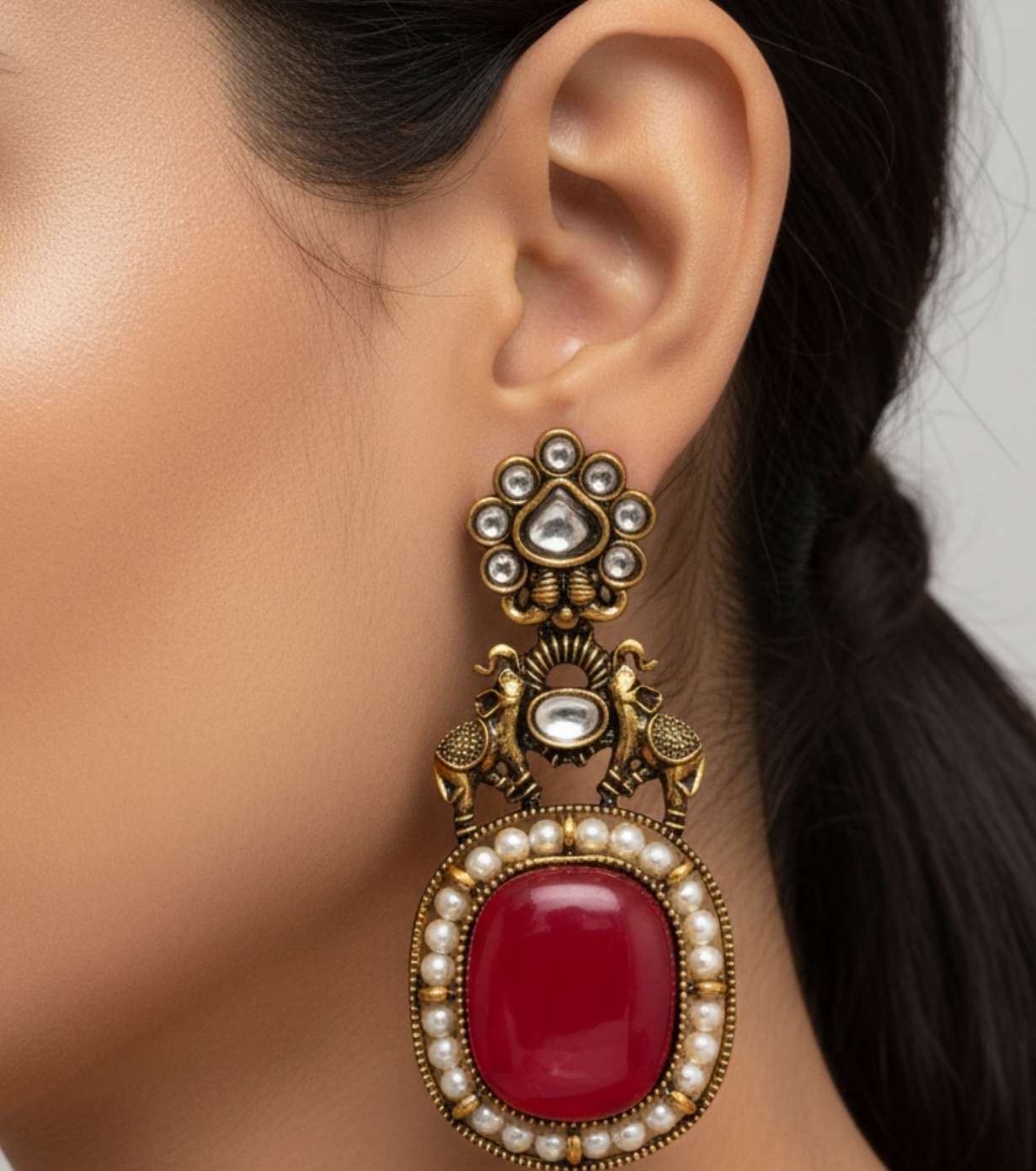 Elevate your ethnic look with these stunning antique-style Kundan earrings, crafted to reflect timeless Indian heritage. Featuring a bold deep red central stone, delicately bordered with hand-set pearls, and finished with intricate peacock motifs, these earrings are a perfect blend of royalty and tradition. Ideal for weddings, festive celebrations, and special occasions, they pair beautifully with sarees, lehengas, and anarkalis.