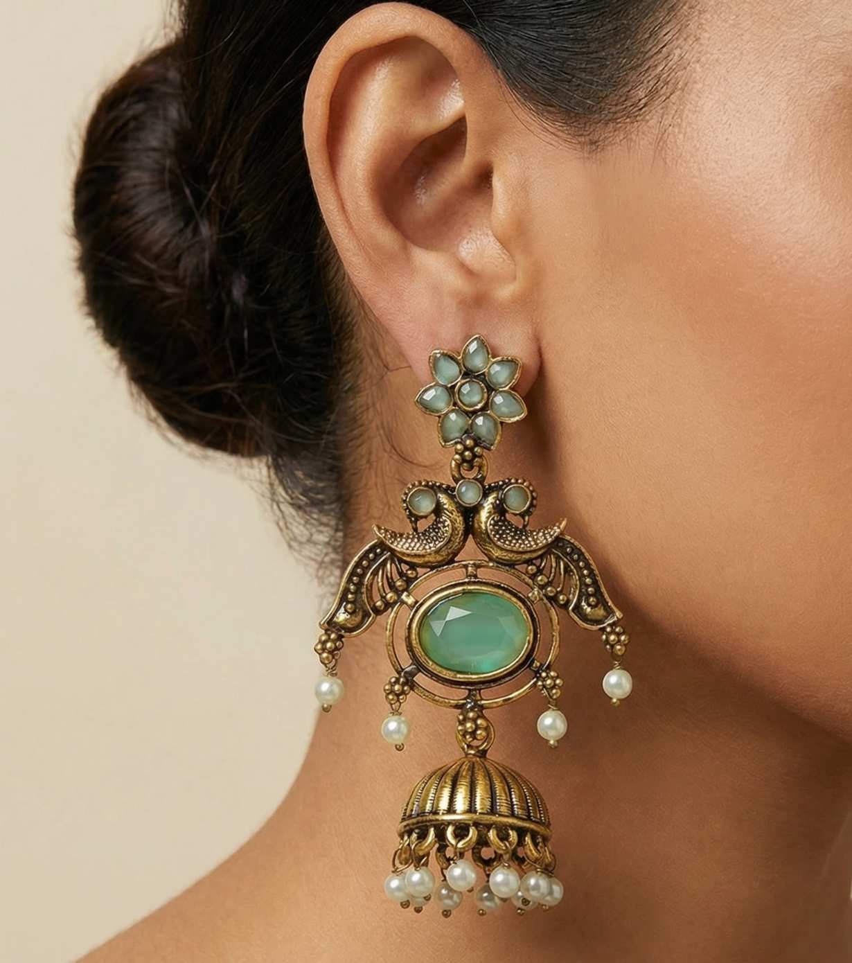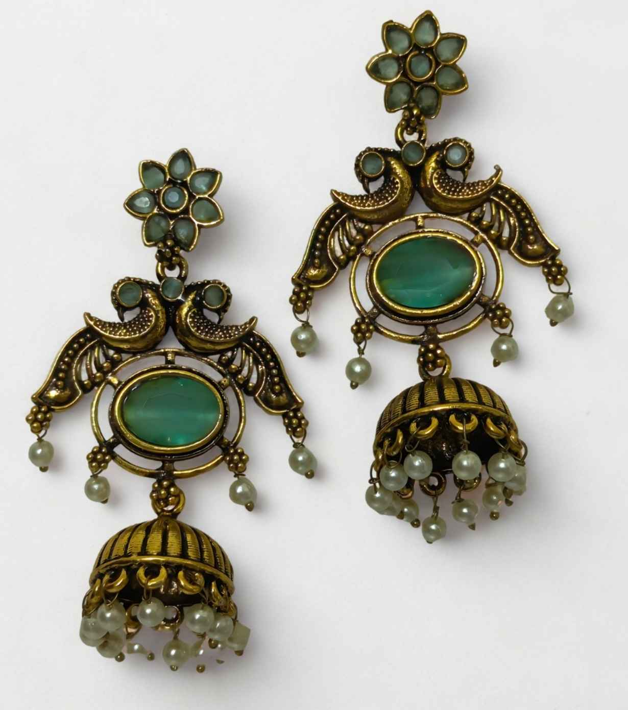 Antique Peacock Jhumka Earrings with Emerald Green Stone