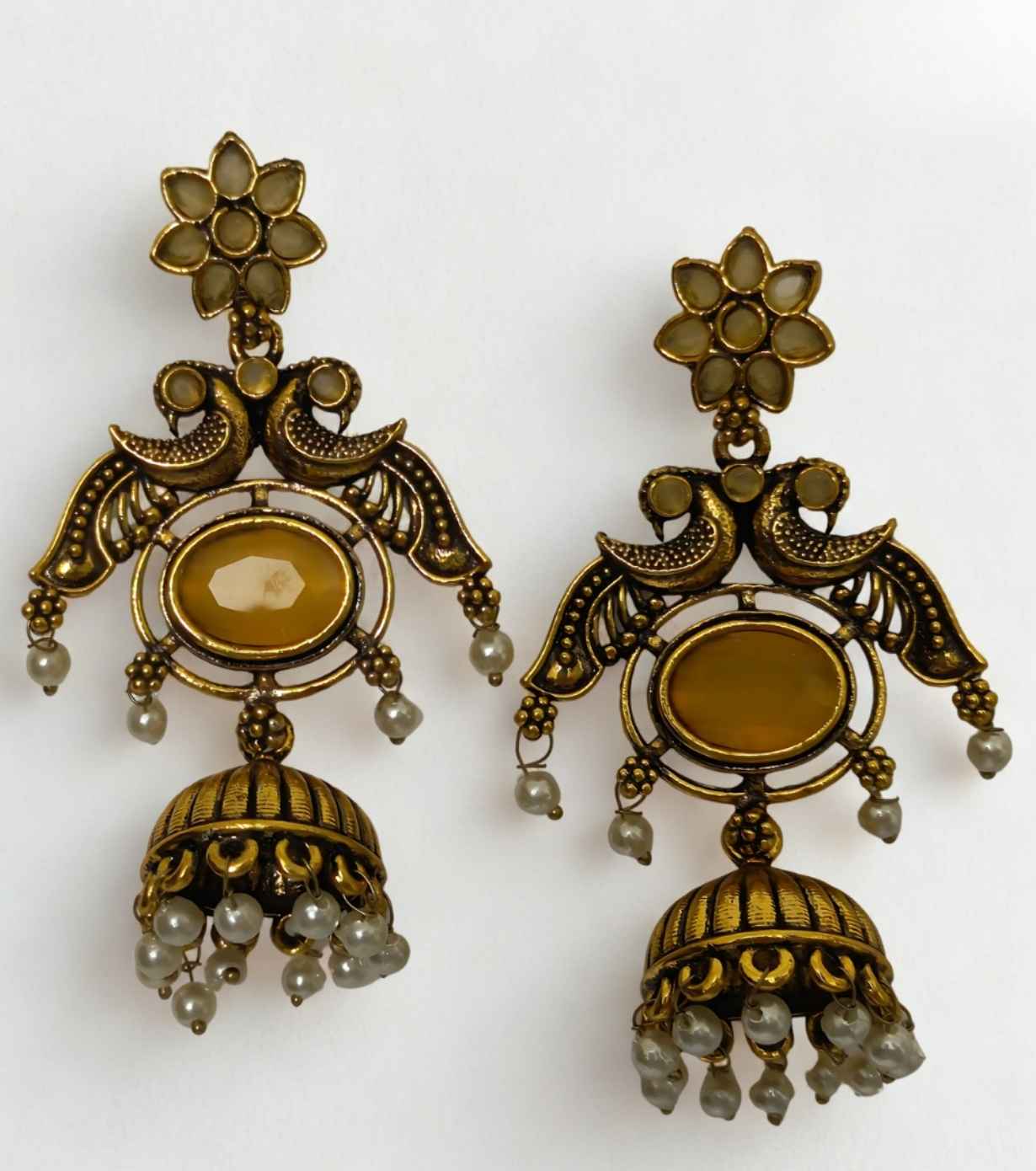 Antique Peacock Jhumka Earrings with Mustard Yellow Stone