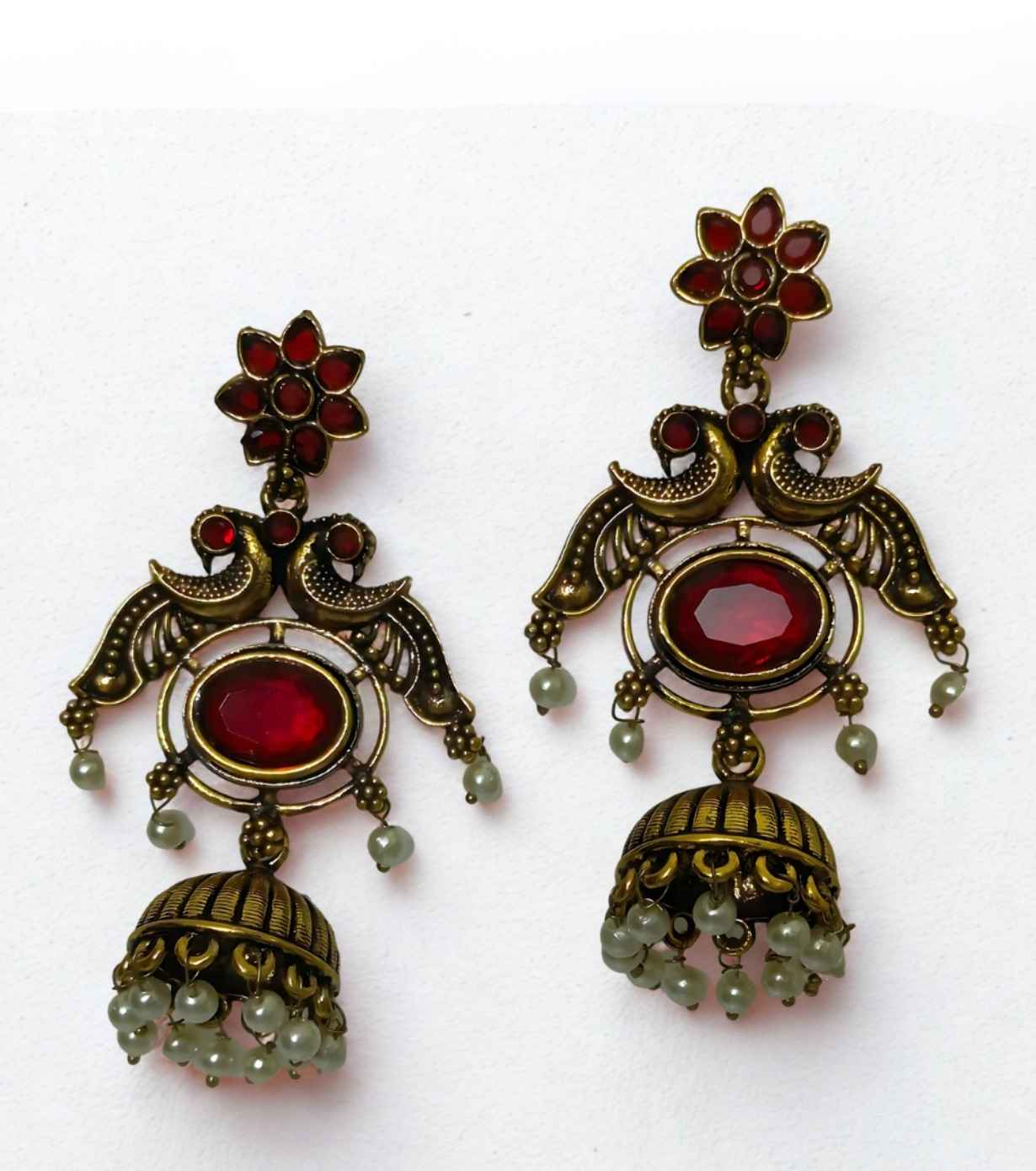 Antique Peacock Jhumka Earrings with Ruby Red Stone