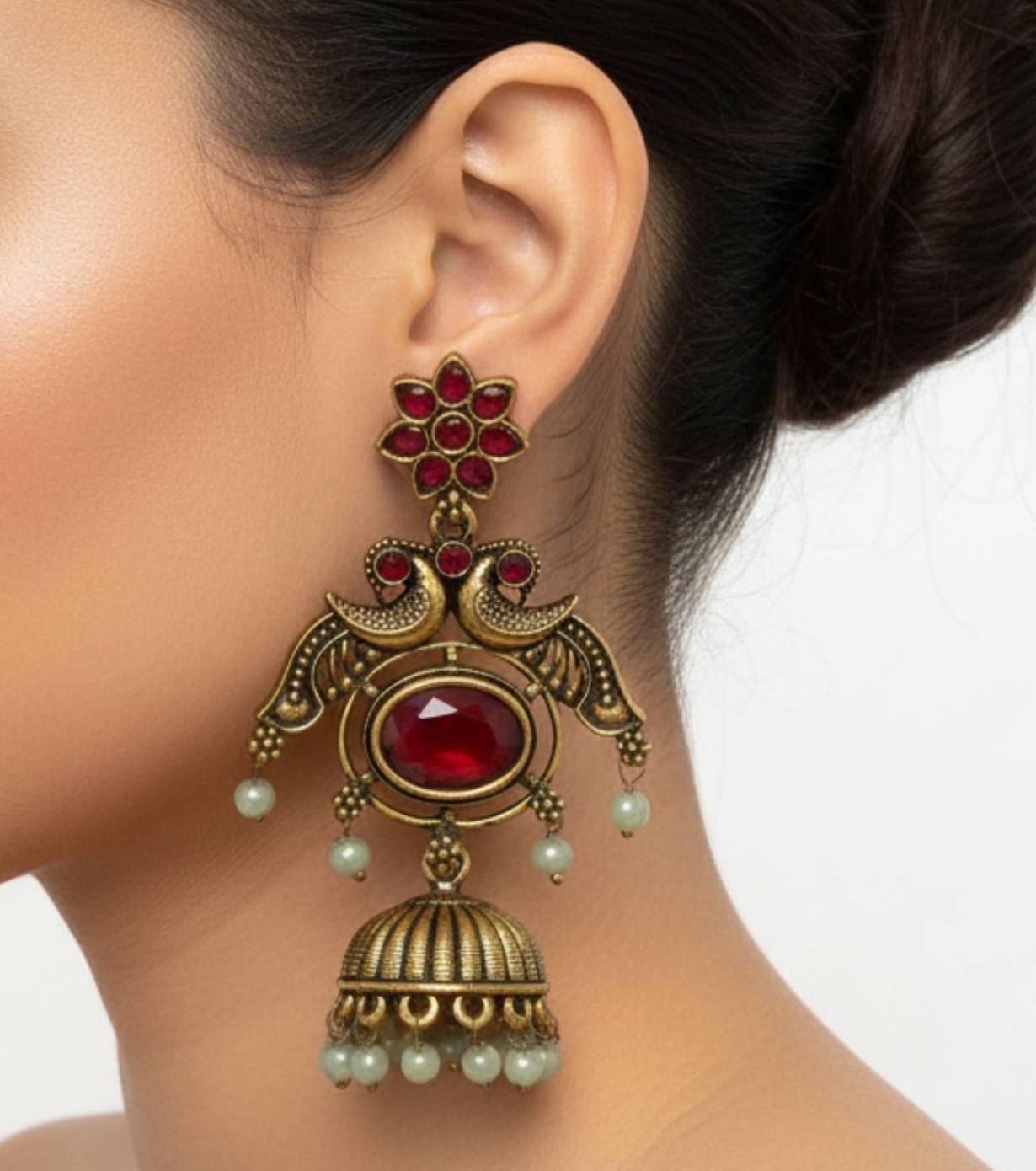These antique-inspired peacock jhumka earrings showcase a rich ruby red oval stone at the centre, framed by intricate peacock motifs and circular antique detailing. The give a classic temple jewellery feel, while the floral stone stud at the top adds elegance. Finished with a traditional jhumka dome and delicate pearl hangings, this pair is perfect for festive and bridal occasions.