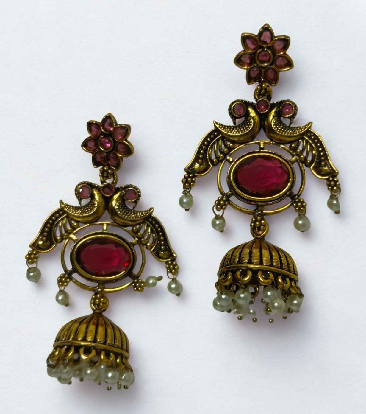 Antique Peacock Jhumka Earrings with Ruby Red Stone
