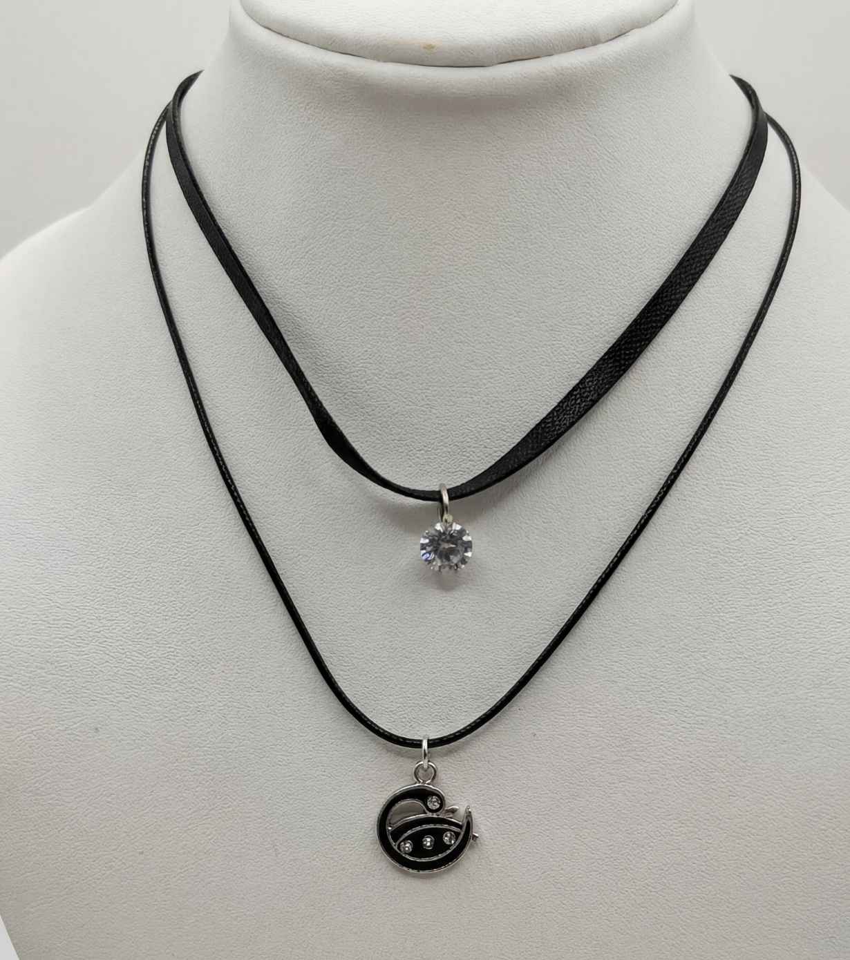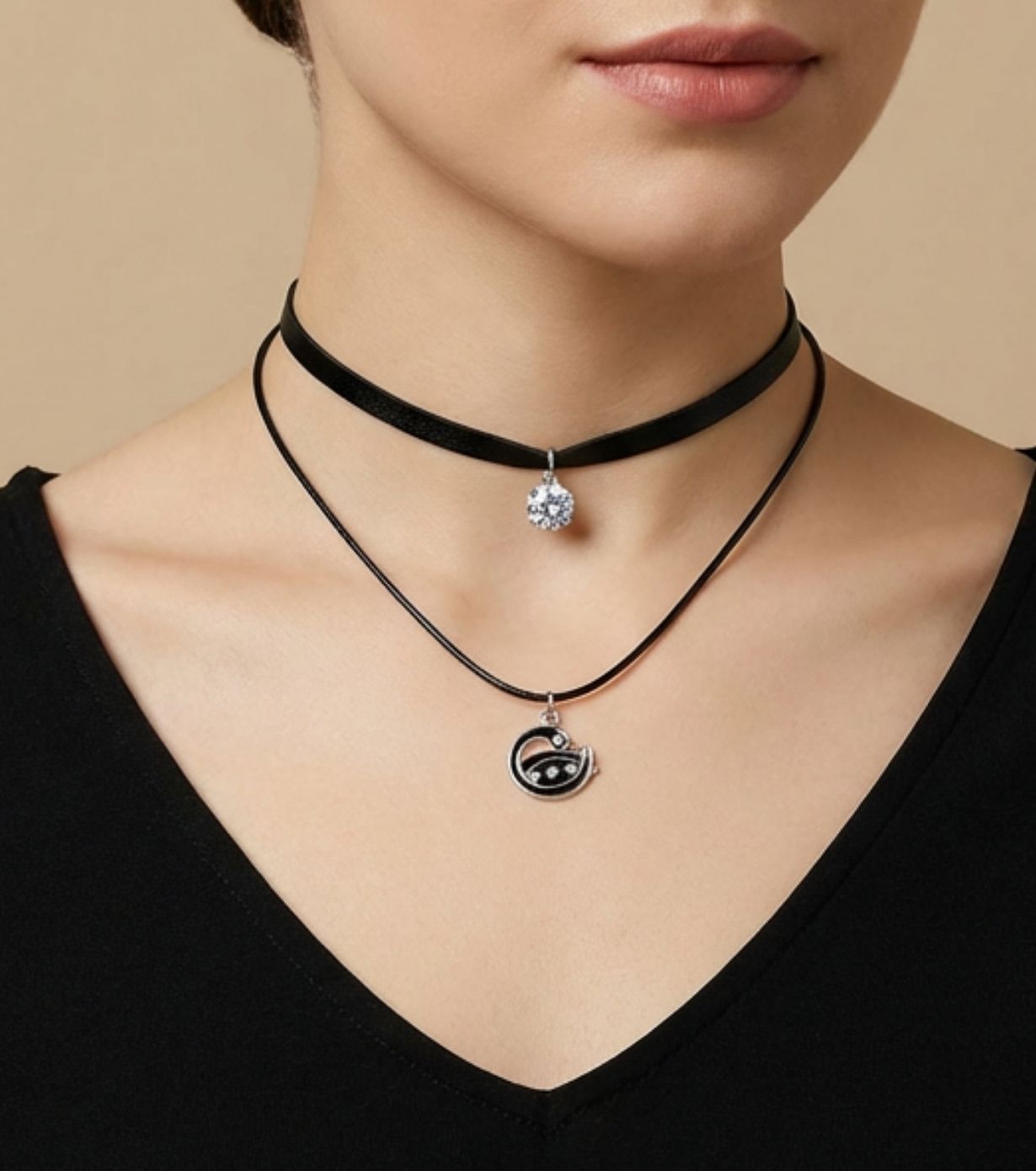 Elevate your everyday style with this Black Layered Choker Necklace featuring a Crystal Charm and Abstract Swirl Pendant. The top layer showcases a brilliant round crystal that adds a subtle sparkle, while the lower layer features a modern circular swirl pendant with embedded stones for a sleek, artistic look.