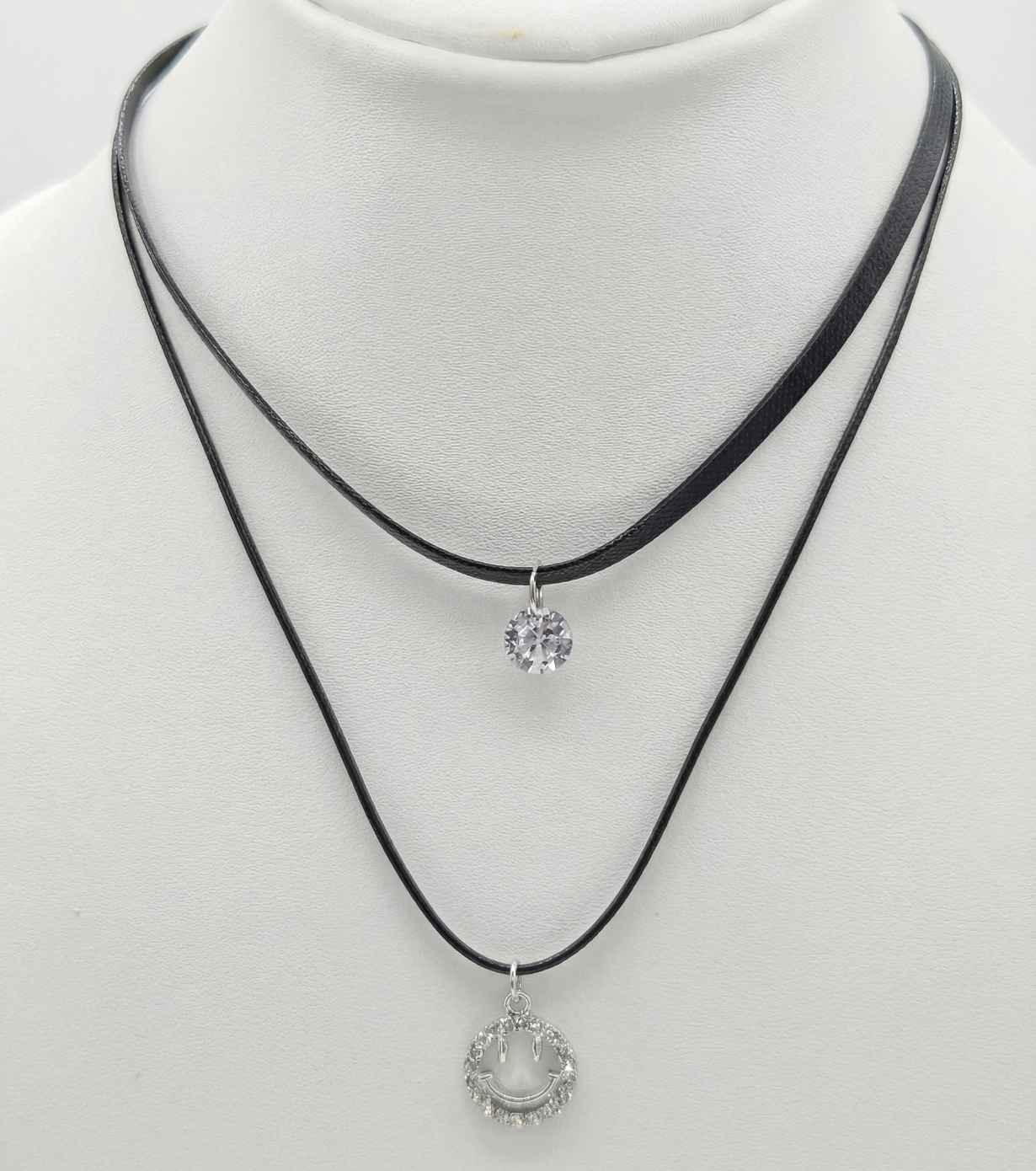 Add a playful yet elegant touch to your style with this Black Layered Choker Necklace with Crystal Smiley Pendant | Trendy Jewelry The upper layer features a shimmering crystal charm that adds subtle sparkle, while the lower layer showcases a trendy smiley face pendant accented with stones for a fun, modern vibe.