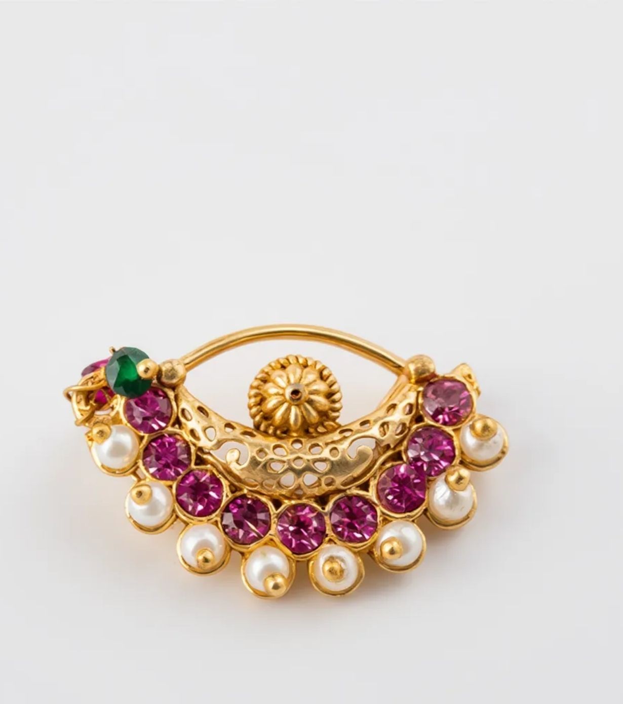 Intricate filigree work and a traditional silhouette make this nose ring an ideal choice for brides and festive occasions. Pair it with sarees, lehengas, or traditional Maharashtrian and Rajasthani outfits for a regal finish.