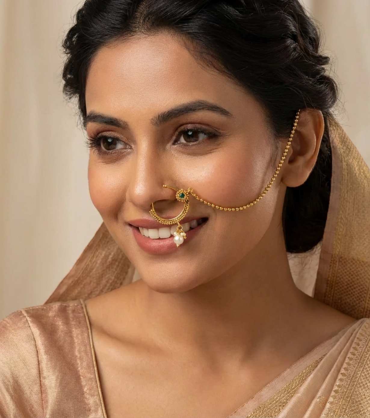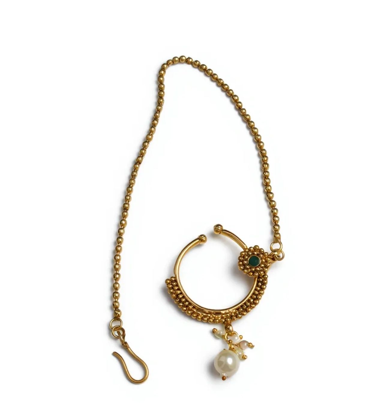 Enhance your traditional look with this beautifully crafted Gold Finish Nath with Chain and Pearl Drop. Featuring intricate beadwork, a classic green stone accent, and a delicate pearl hanging charm, this nath embodies timeless ethnic elegance.