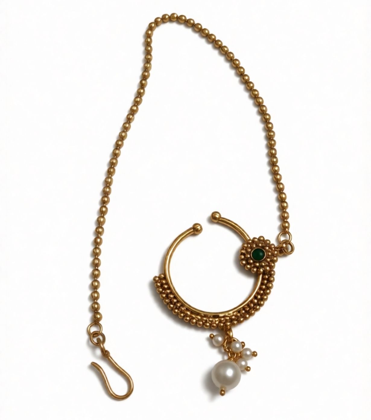 Complete your traditional look with this Gold Plated Maharashtrian Nath with Pearl Drop Ball Chain | Wear Your Jewellery, beautifully designed with a ball chain, green stone accent, and elegant pearl drop detailing. Inspired by heritage bridal jewellery, this nath adds grace and cultural charm to any ethnic attire.