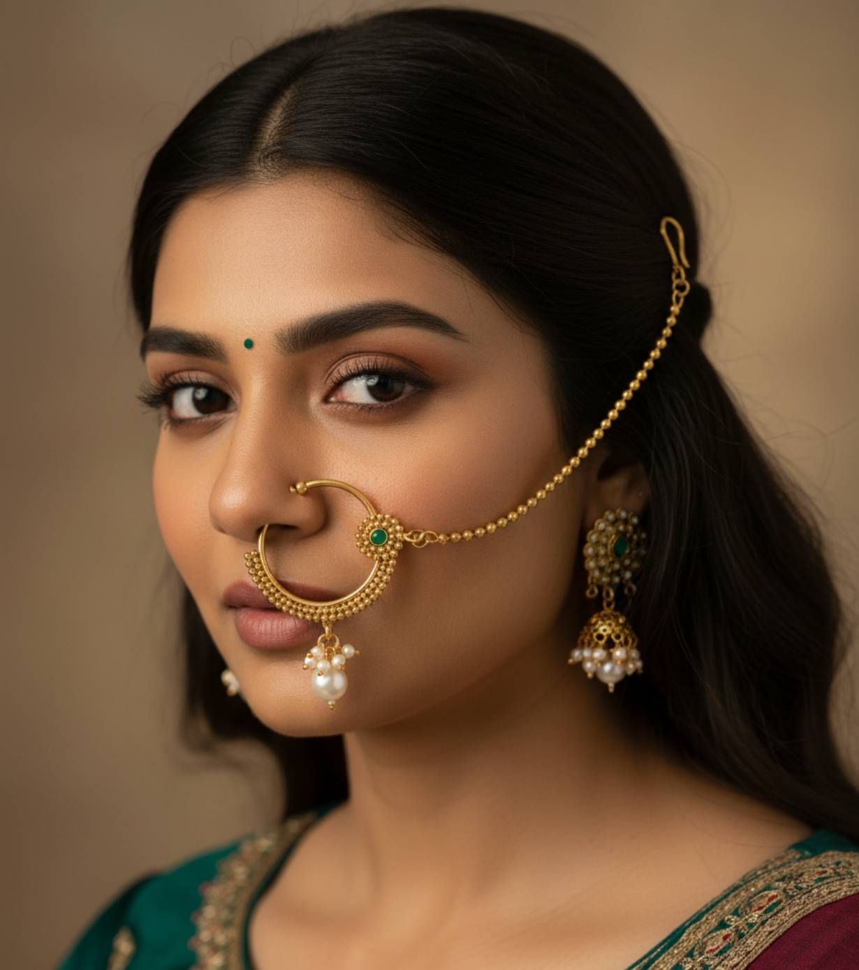 The lightweight open-ring design ensures comfortable wear, while the secure hook chain provides easy attachment to hair or ear for a traditional finish. Ideal for weddings, nauvari sarees, festivals, poojas, and cultural celebrations, this nath is a timeless accessory for bridal and festive occasions.