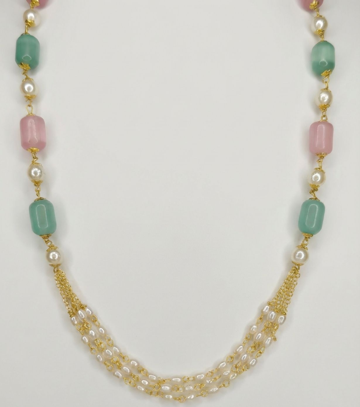 | Color | Necklace Colour: Gold Bead Colours: Pastel Green, Pastel Pink Pearl Colour: White Accent Colour: Gold |