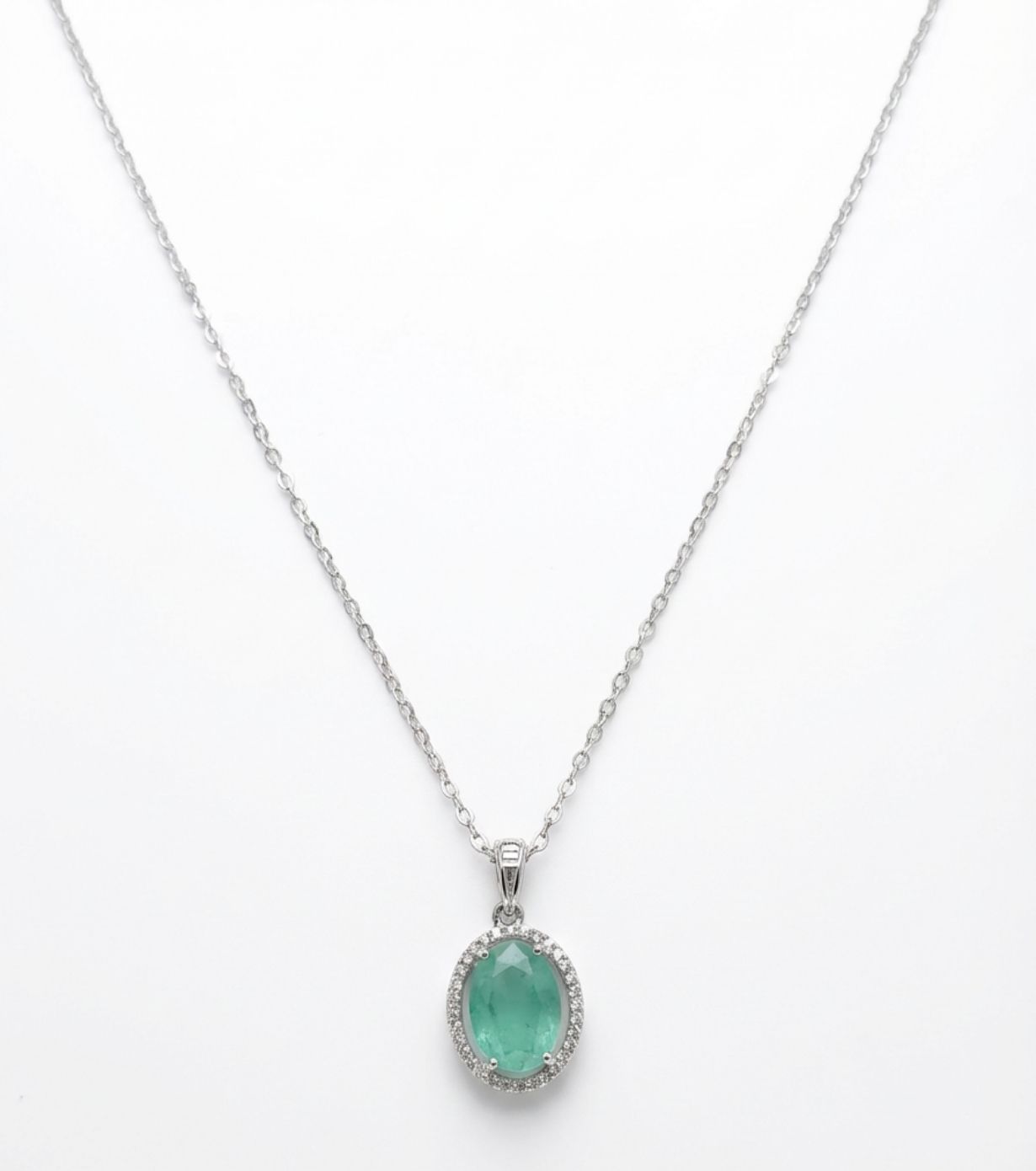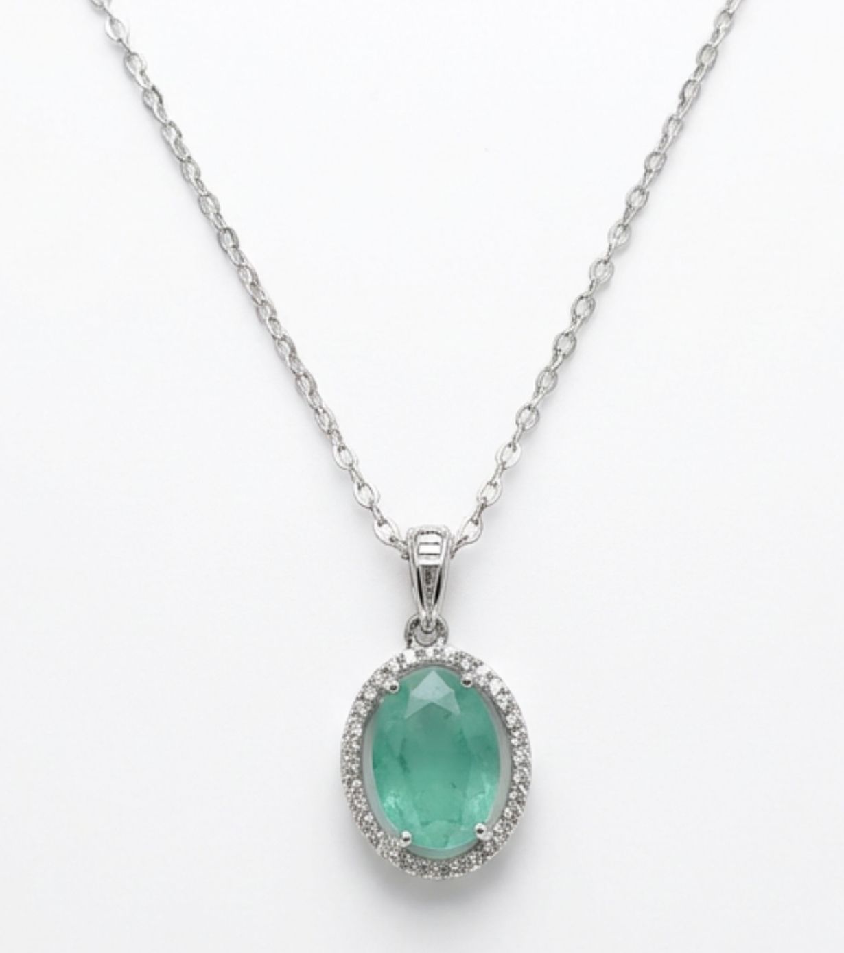 This elegant pendant necklace showcases a striking oval-shaped green cubic zirconia at the center, framed by a delicate halo of clear CZ stones. The silver-tone finish adds a refined touch, making it a versatile piece that pairs beautifully with both western and ethnic outfits.