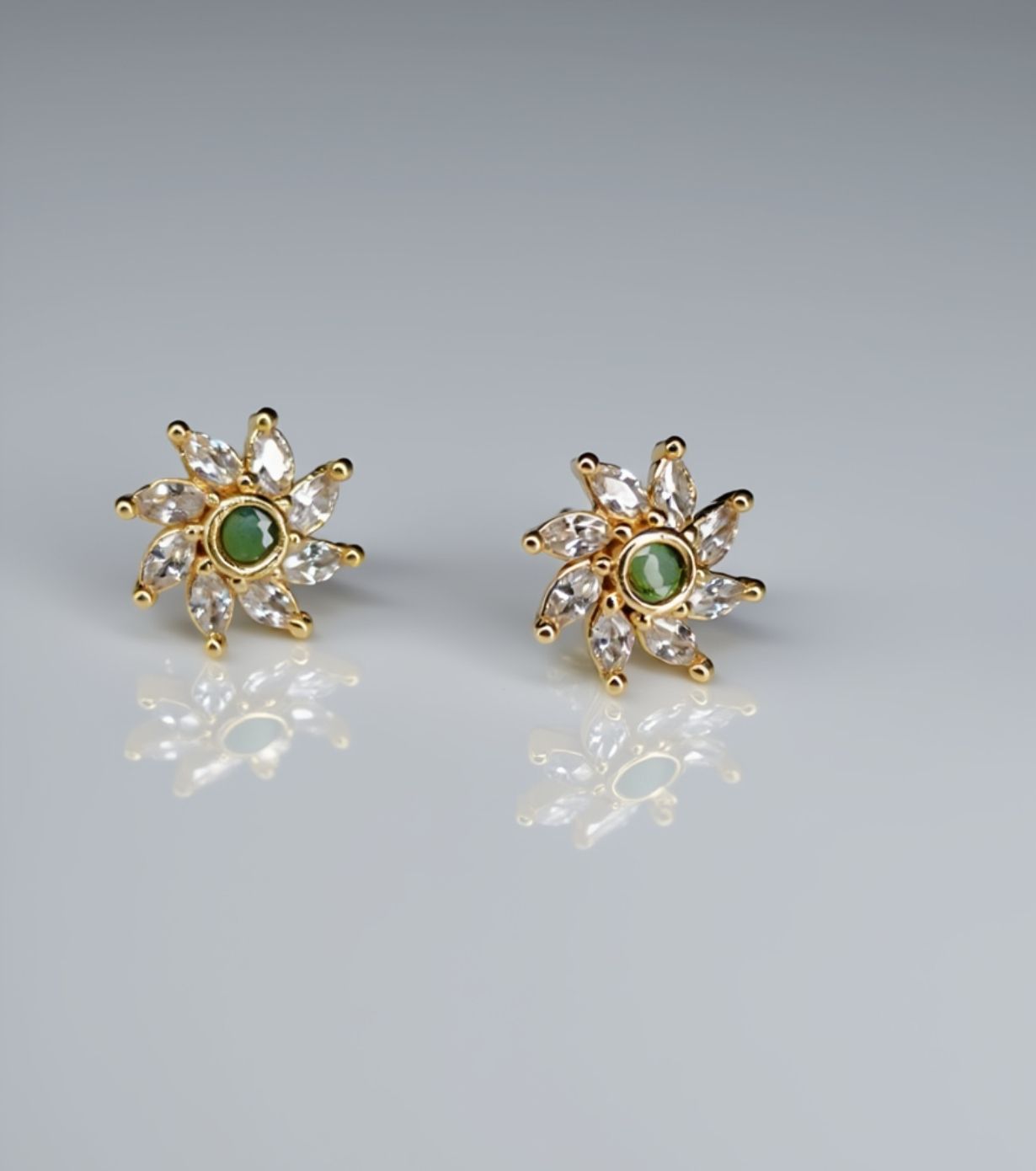 Green Stone Floral Stud Earrings with Crystal Petals | Gold Finish Imitation Jewellery