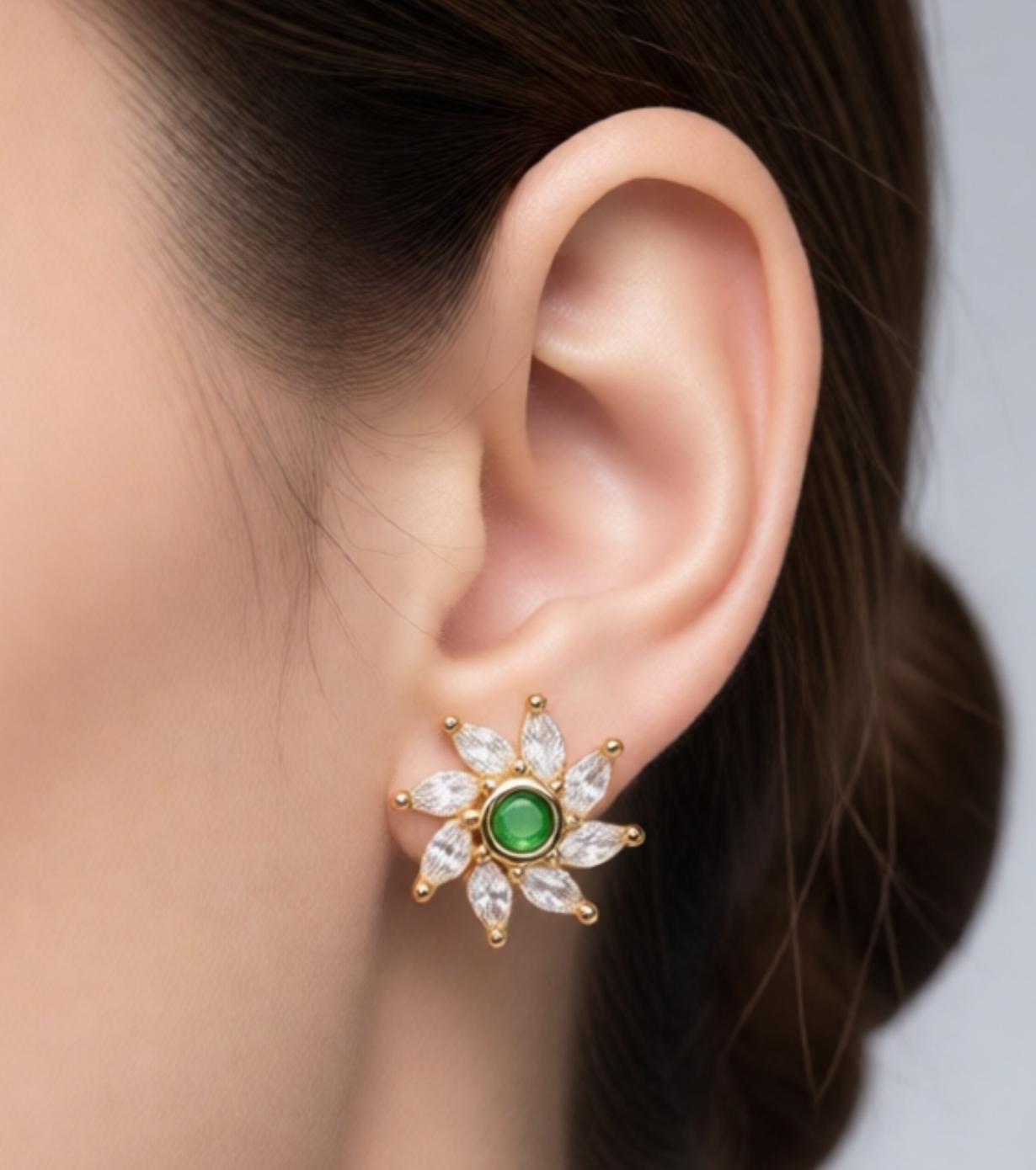 Be the first to review “Green Stone Floral Stud Earrings with Crystal Petals | Gold Finish Imitation Jewellery”