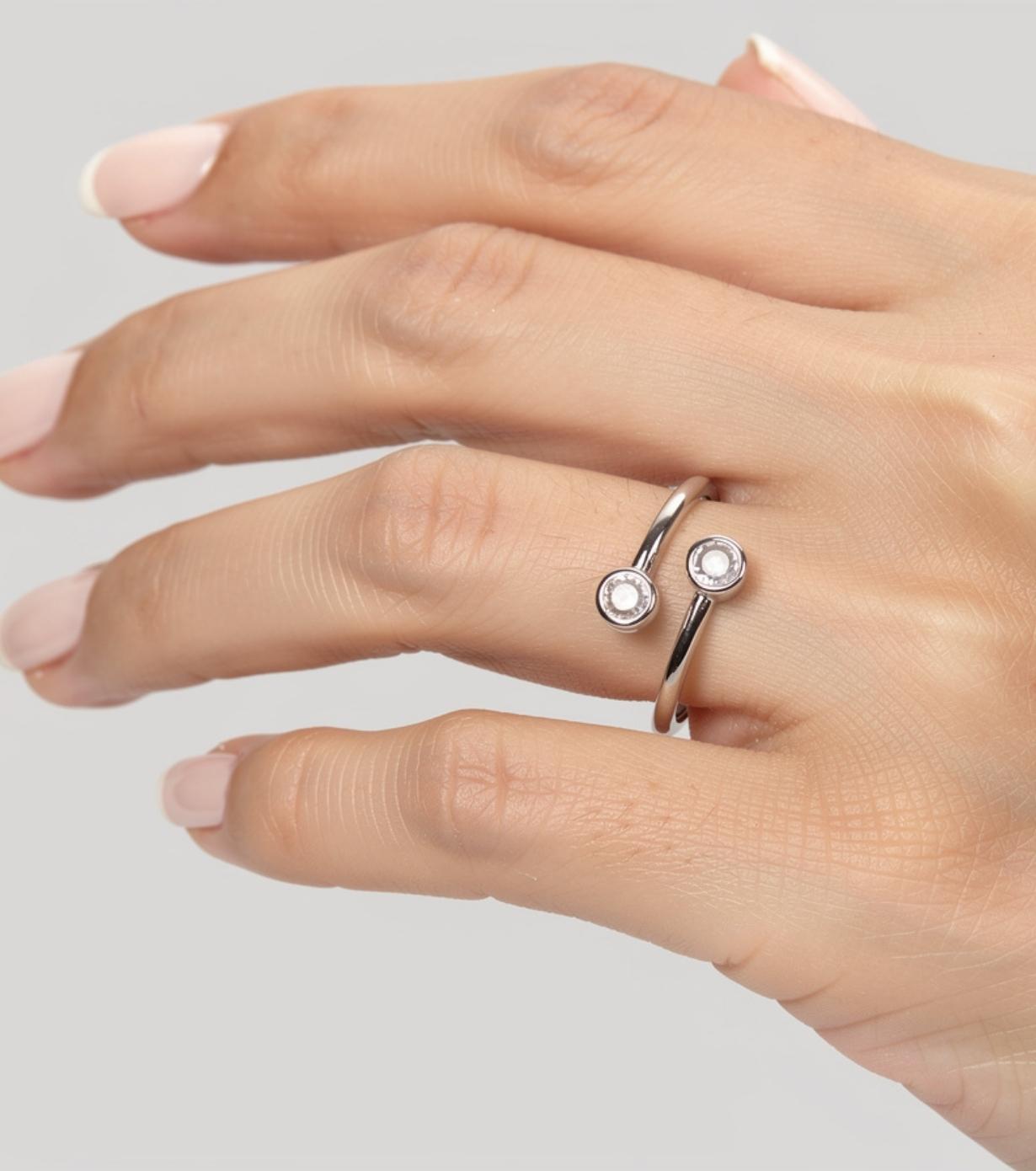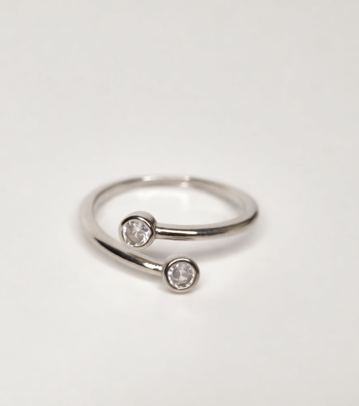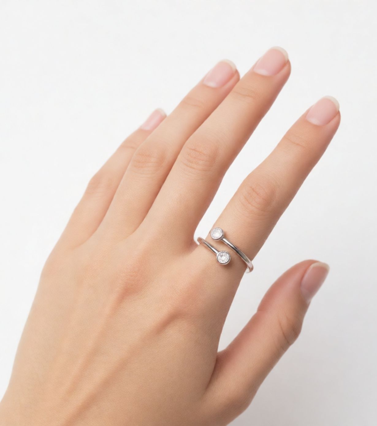 Add a touch of modern elegance to your jewellery collection with this Minimalist Silver Open Adjustable Ring with Dual Crystal Stones for Women. Designed with a sleek open band and finished with two sparkling round crystal stones, this ring offers a perfect balance of simplicity and sophistication.