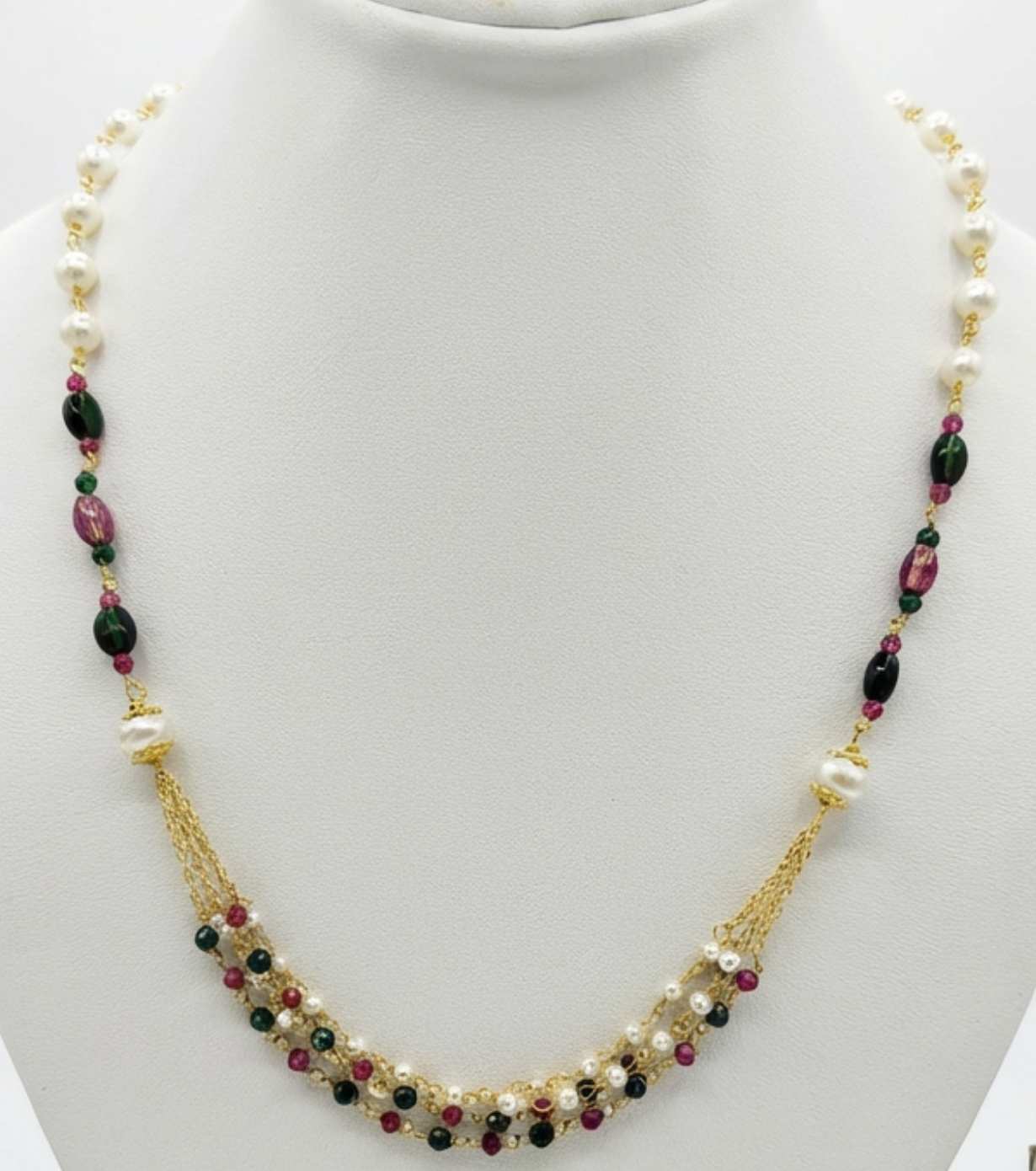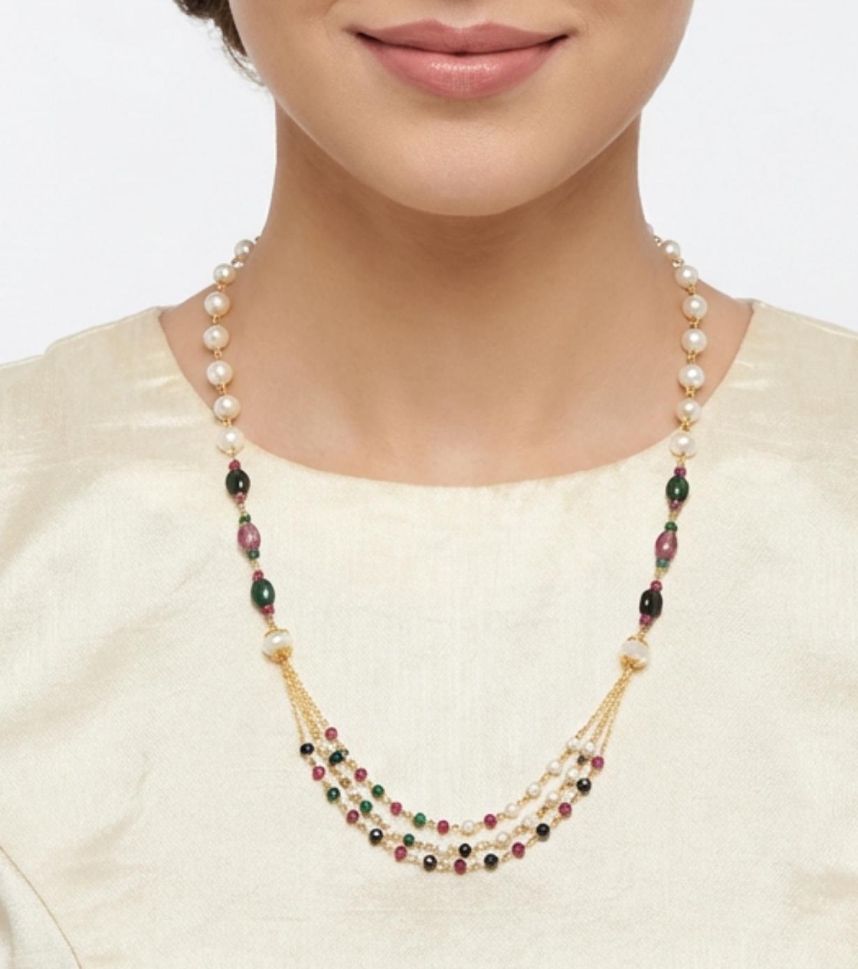 Add timeless elegance to your jewelry collection with this Multi-Strand Pearl Bead Necklace with Gold Finish | Elegant Fashion Jewelry. Designed with a graceful blend of white pearls, deep green and maroon beads, and layered gold-tone chains, this necklace creates a rich and traditional aesthetic.