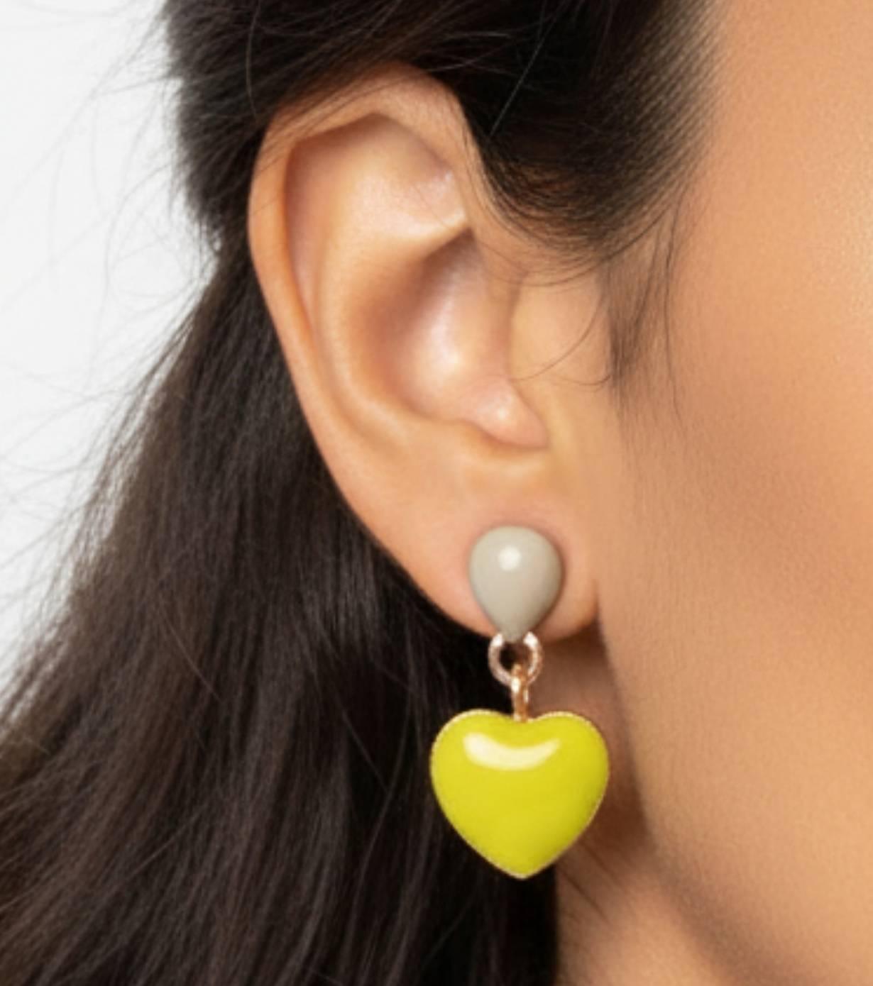 Brighten up your jewellery collection with these Yellow Heart Drop Stud Earrings for Women – Glossy Enamel Jewellery. Designed with a shiny enamel yellow heart suspended from a minimal stud top, these earrings add a cheerful and stylish touch to any outfit.