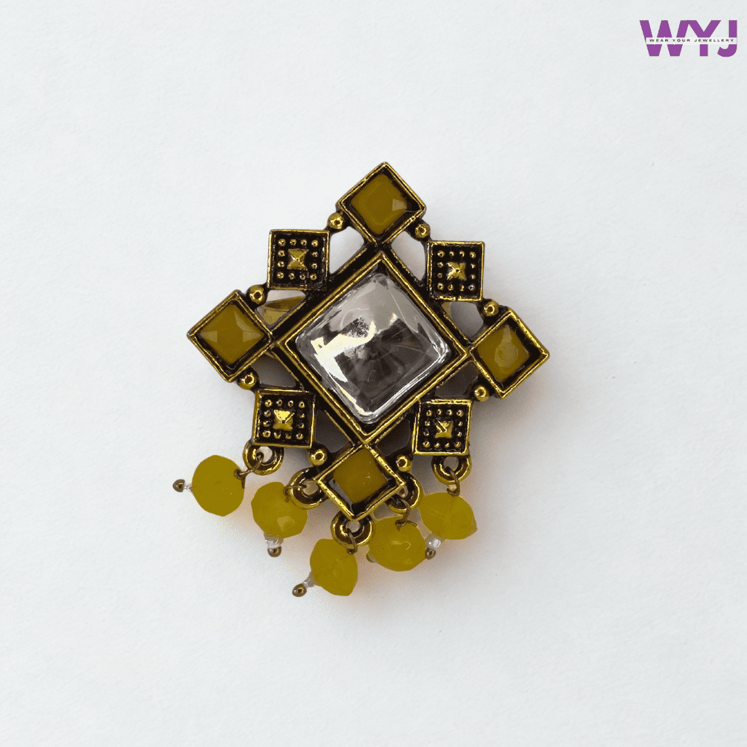 Antique Gold-Plated Geometric Mirror Ring with Yellow Beads | Adjustable Statement Ring: Step into the world of heritage-inspired elegance with this Antique Gold-Plated Geometric Mirror Ring. Featuring a bold square mirror centerpiece surrounded by alternating enamel and textured squares, this ring brings together artistry and geometry. The dangling yellow beads add a lively touch, making it perfect for festive occasions, weddings, and cultural celebrations.