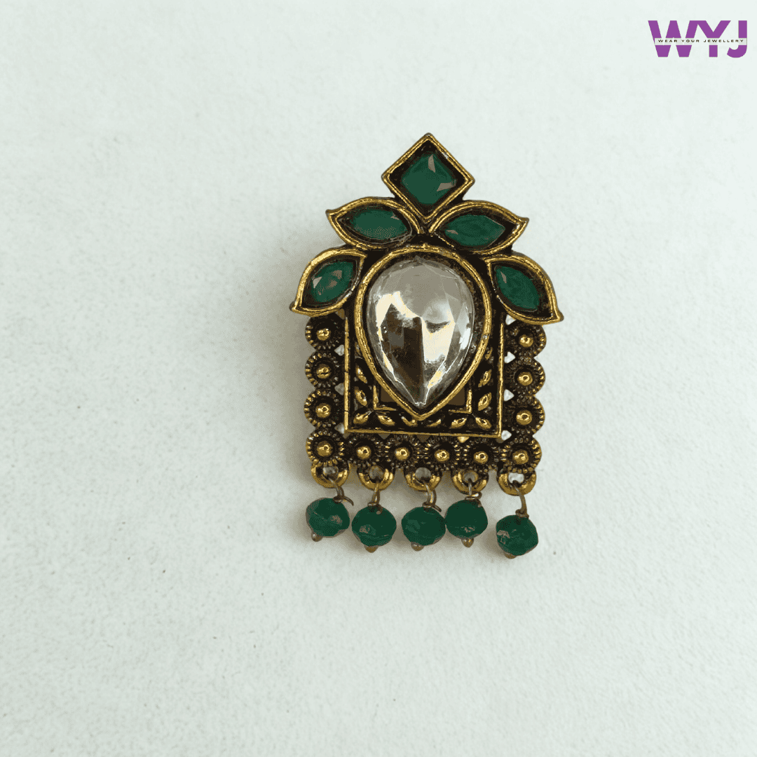 The antique gold detailing and hanging green beads add a graceful charm, making it a perfect accessory for weddings, festive occasions, or ethnic celebrations. With its adjustable band, this handcrafted piece promises both style and comfort, making it a must-have for your jewelry box