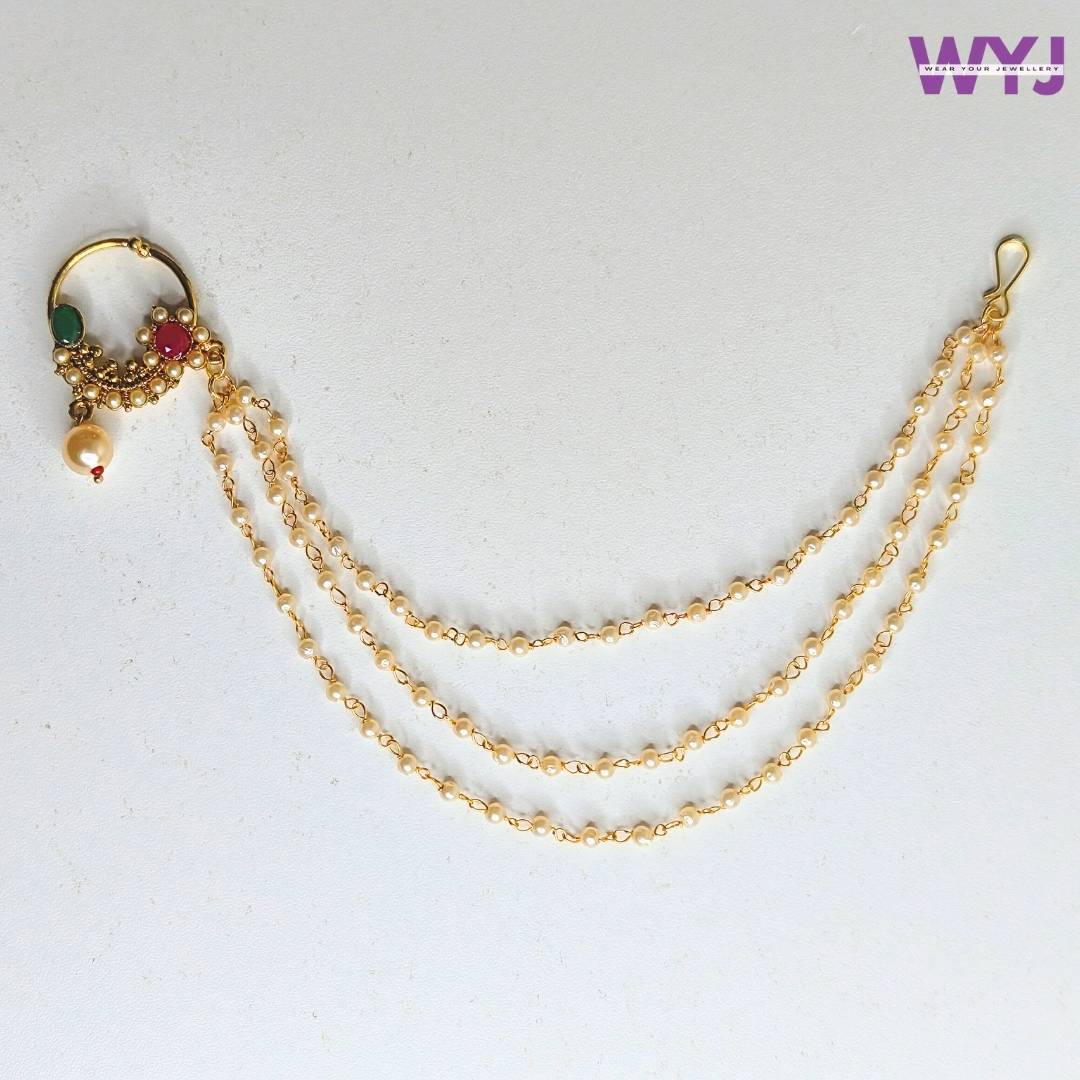 Bridal Nath with Multi-Layer Chain & Pearl Drop: Bring timeless elegance to your bridal look with this gold-plated Nath (nose ring) featuring triple-layer chains and pearl embellishment. The Nath is beautifully designed with a delicate pearl drop and dual stone accents (green & red), adding a royal touch to your traditional attire.