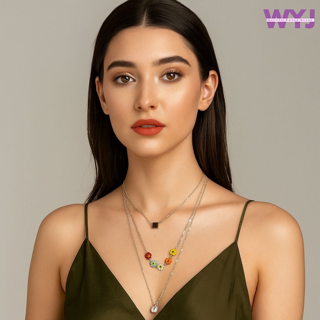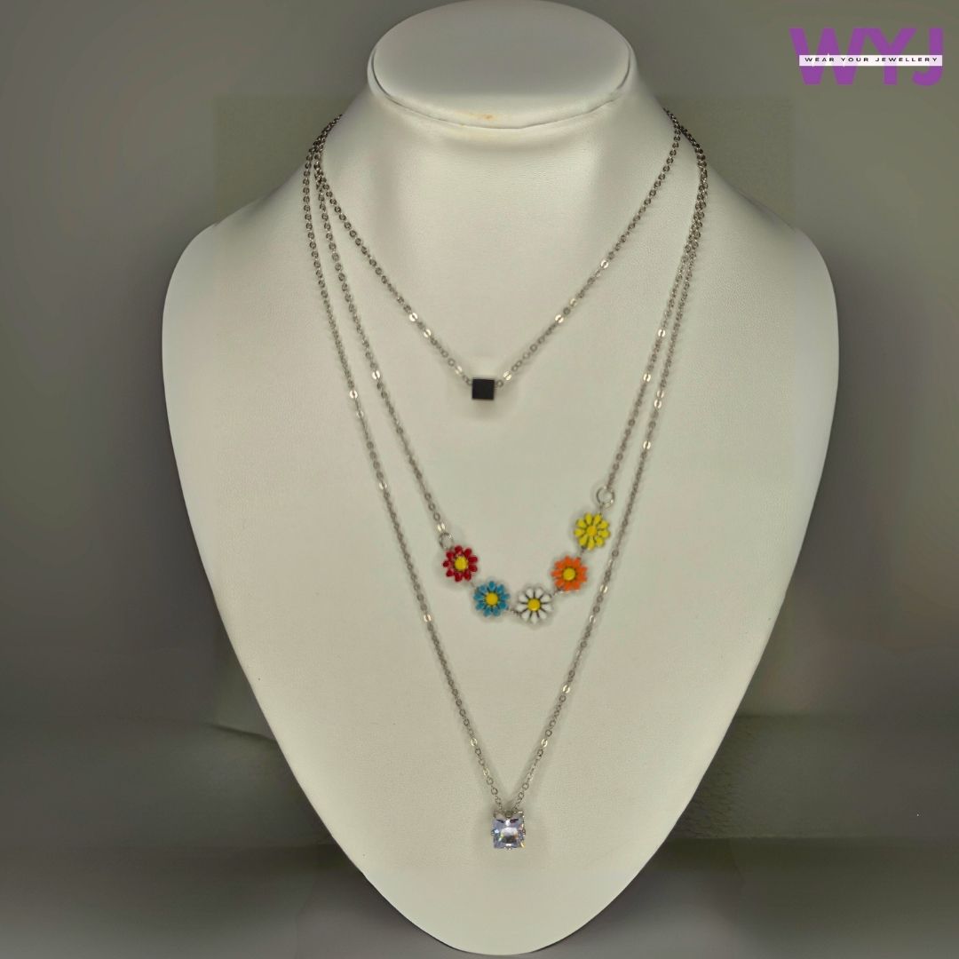 Silver Multi-Layered Chain Necklace with Colorful Floral Charm | WYJ: This triple‑layer necklace combines a modern cube charm near the collarbone, a mid‑strand of bright enamel daisy charms for a pop of colour, and a longer chain anchored by a faceted cubic zirconia solitaire that catches the light. The staggered lengths follow layering best practices to keep each focal element visible, creating depth without crowding and pairing easily with basics, florals, or festive looks.